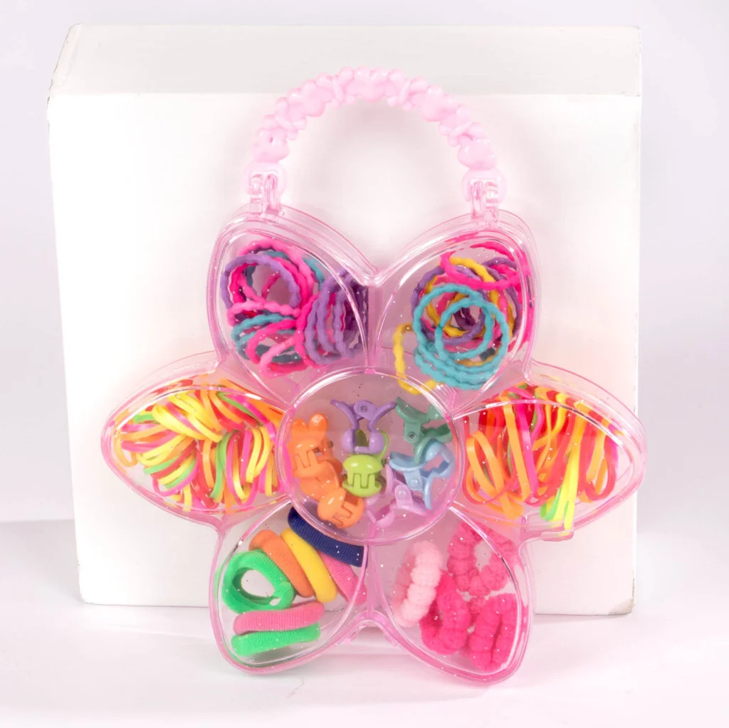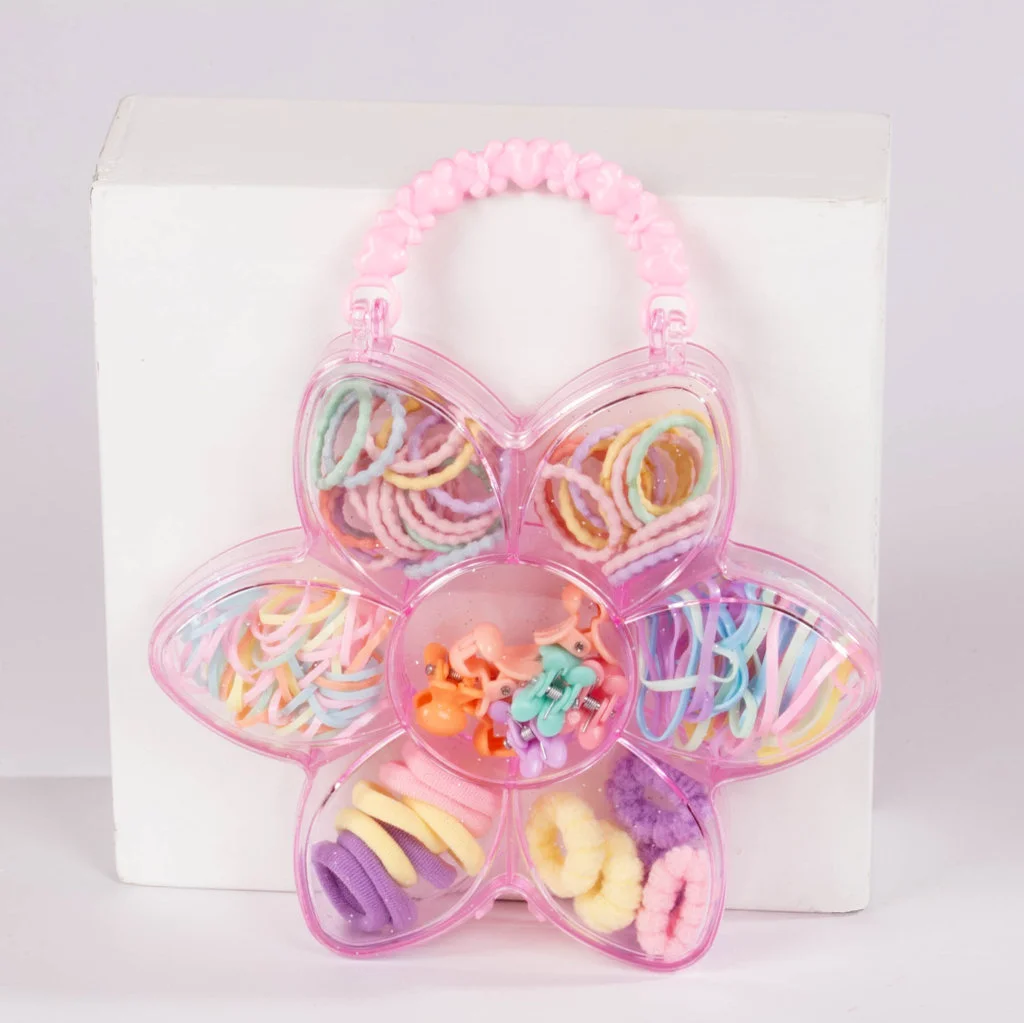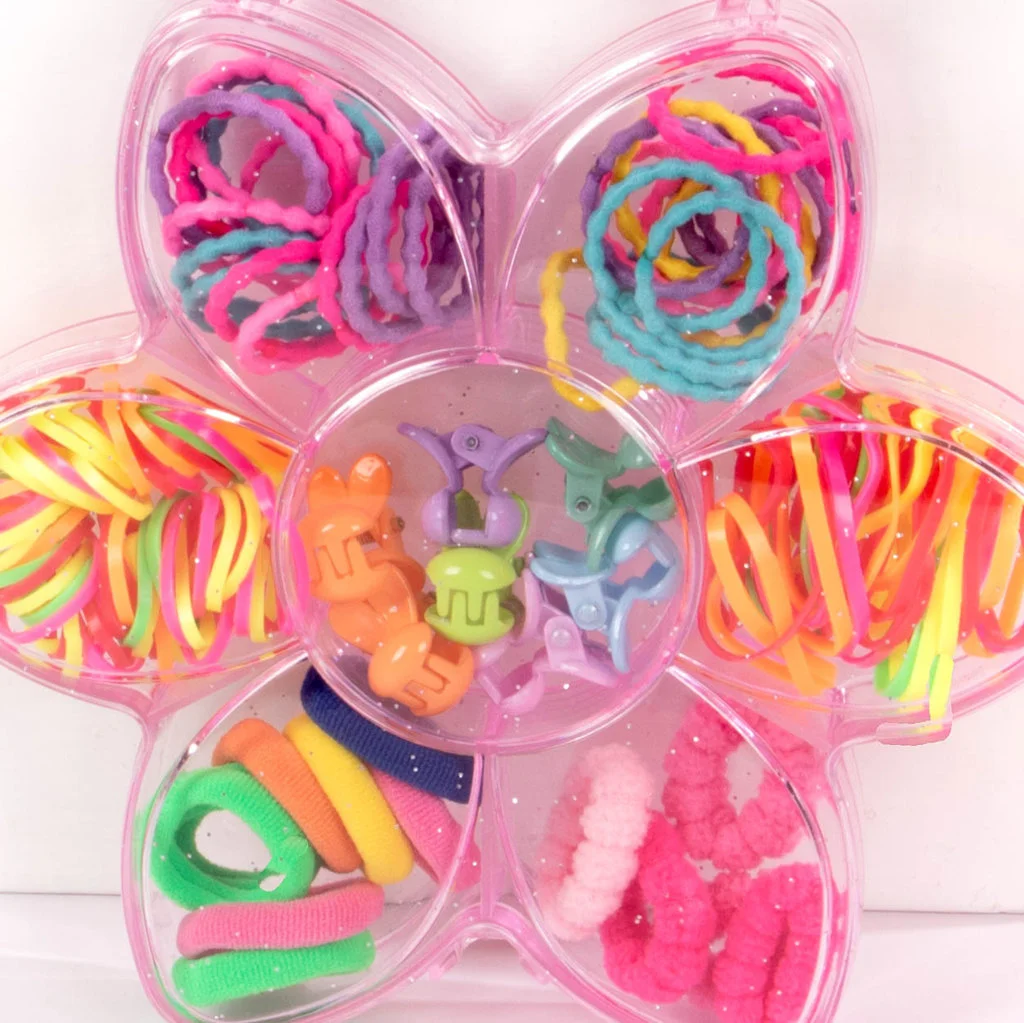 Este adorable set de accesorios para el cabello viene en una práctica caja con forma de flor. Contiene una amplia selección de gomitas elásticas y clips decorativos en colores vibrantes y alegres. Es la opción perfecta para niñas que disfrutan jugar con peinados y accesorios de moda. ¡Divertido, colorido y súper útil!