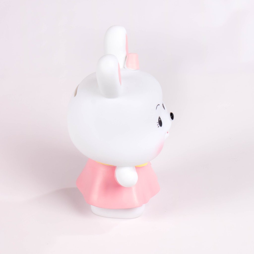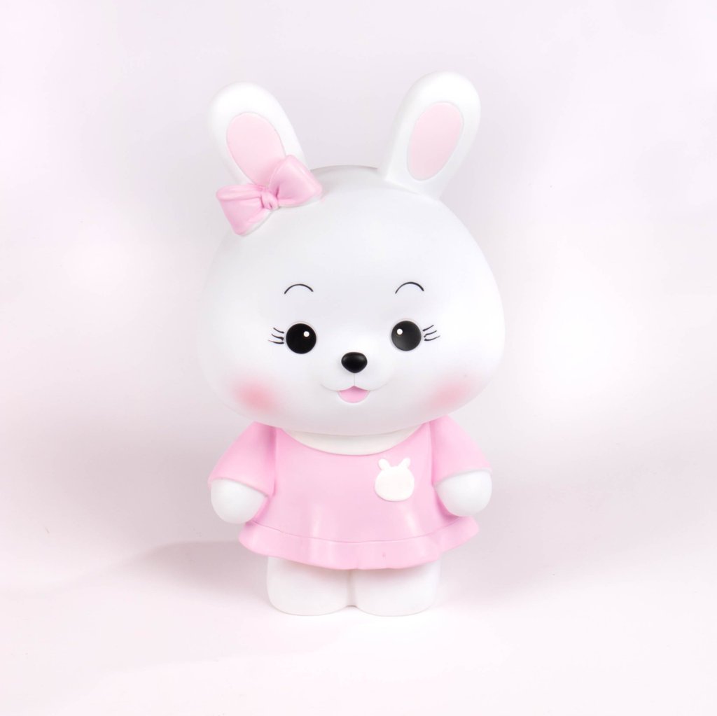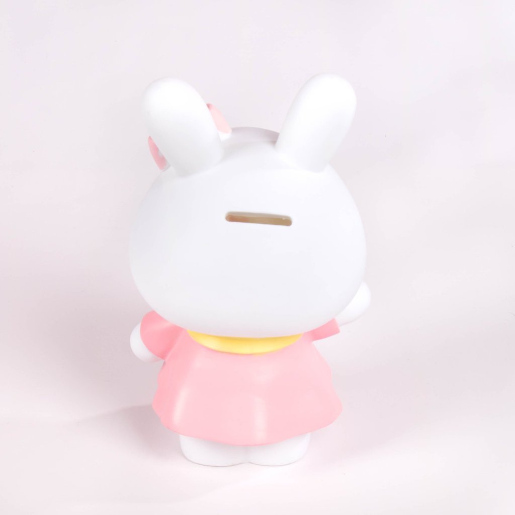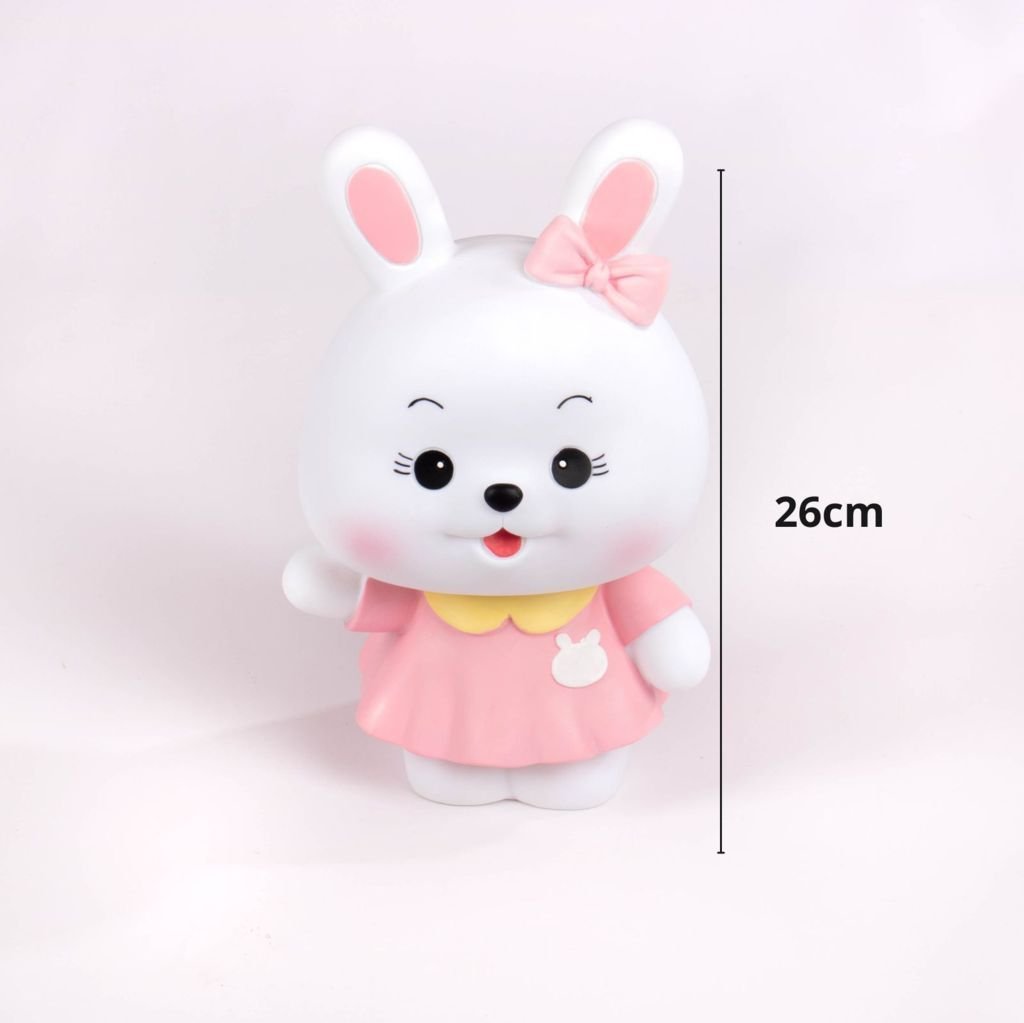 Divertida alcancía infantil con diseño de conejo, de 20 cm ideal para fomentar el ahorro en niños de forma entretenida. Disponible en dos versiones: una con una tortuga en la cabeza y otra con un pato. Su estilo tierno y decorativo la hace perfecta para habitaciones infantiles, escritorios o como regalo original. Cuenta con una ranura superior para insertar monedas y tapón inferior para retirarlas fácilmente.