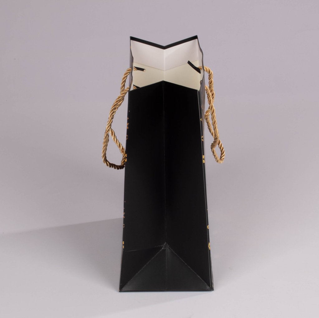Fabricadas en cartón laminado de alta resistencia con acabado mate. Cuentan con asas de cordón trenzado que proporcionan un agarre cómodo y seguro, manteniendo la estructura firme y estable.