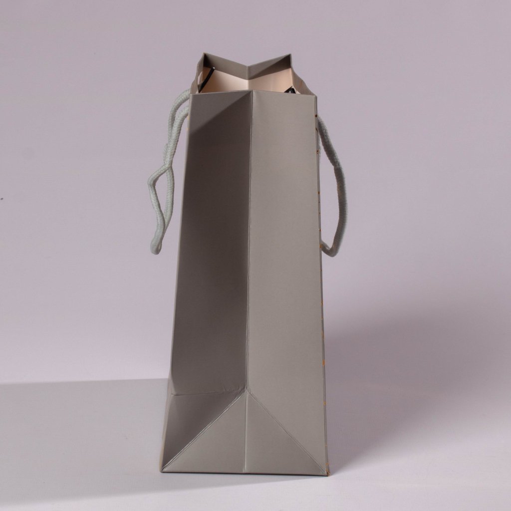 Fabricadas en cartón laminado de alta resistencia con acabado mate. Cuentan con asas de cordón trenzado que proporcionan un agarre cómodo y seguro, manteniendo la estructura firme y estable.
