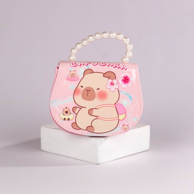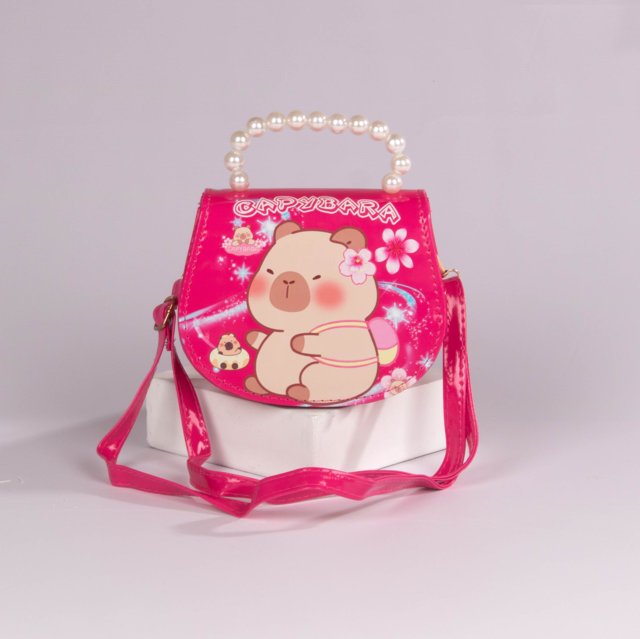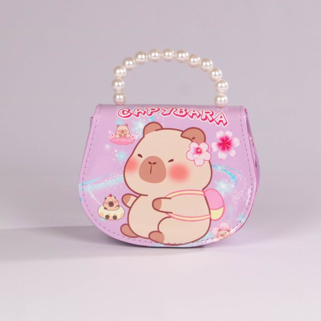 Bolso infantil con diseño de capibara y agarradera decorada con perlas, ideal para niñas que aman los accesorios tiernos y coloridos. Disponible en tonos rosa, fucsia y lila, este bolso combina estilo y practicidad, perfecto para complementar cualquier outfit o llevar sus pequeños objetos favoritos.