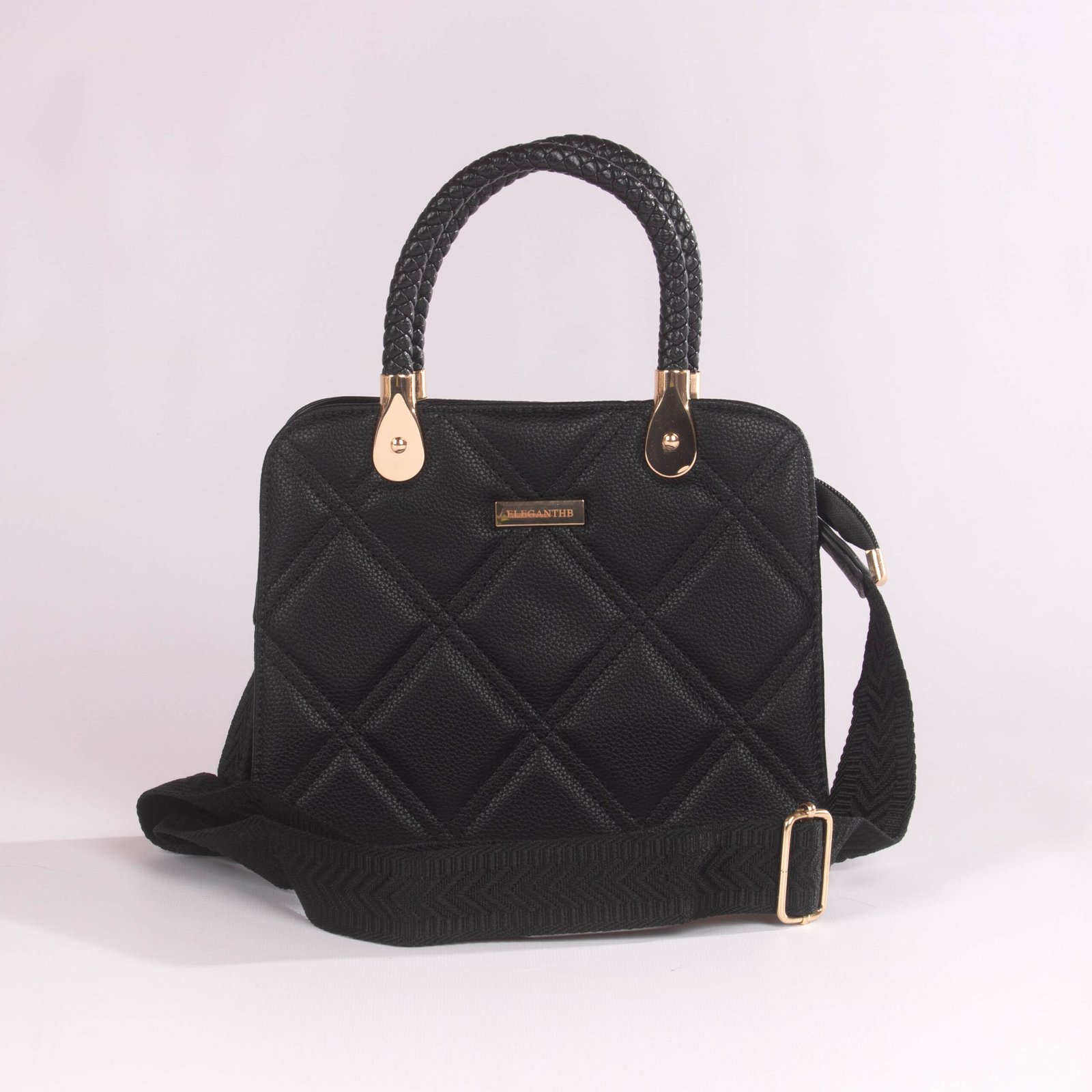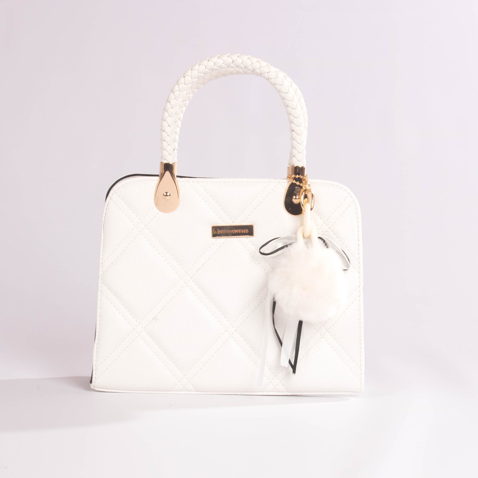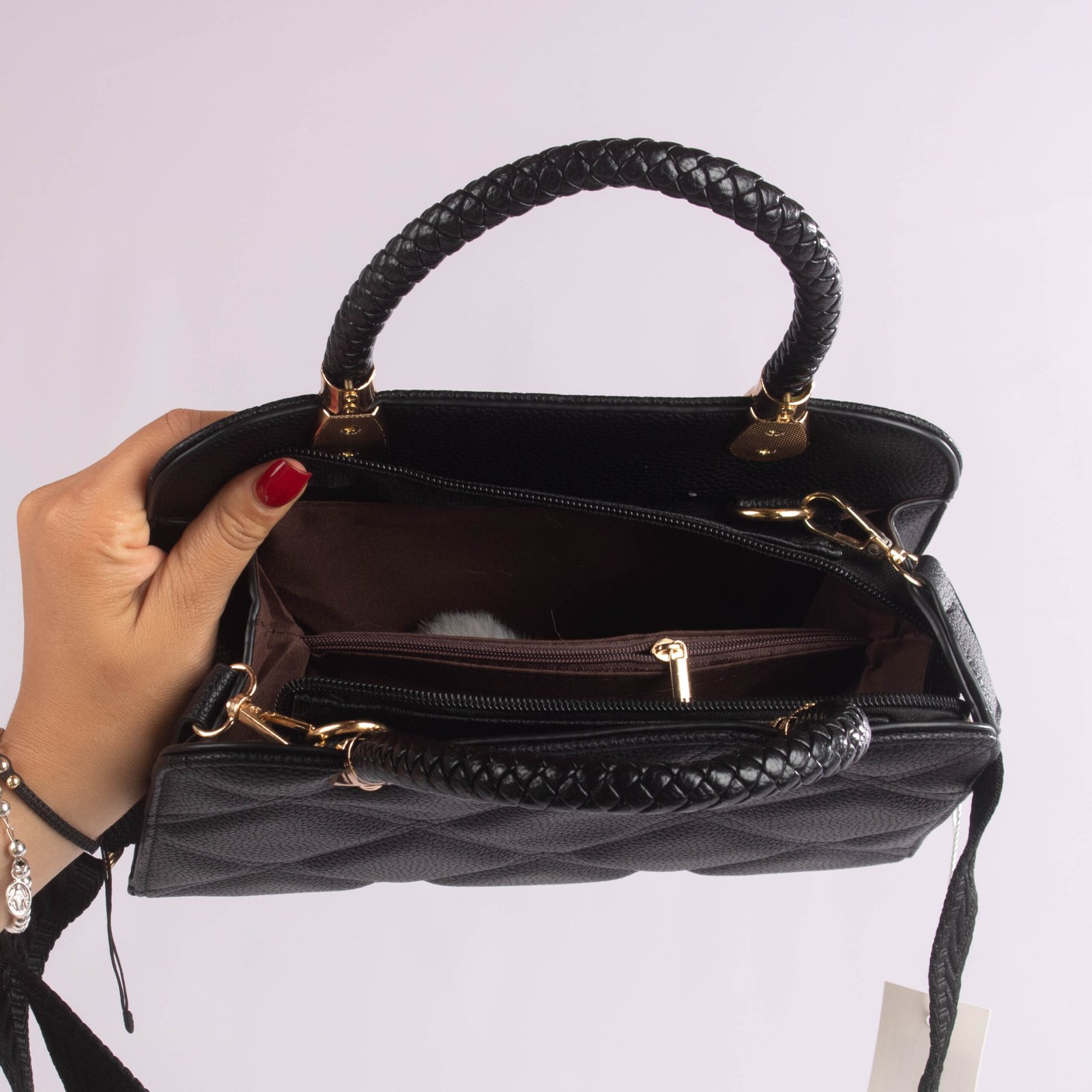 Cartera de mano estructurada con diseño de rombos en relieve que simula un efecto acolchado elegante. Incorpora asas rígidas tejidas y herrajes metálicos en tono dorado. Incluye un llavero decorativo en forma de pompón, que aporta un detalle moderno y sofisticado. Disponible en colores clásicos que se adaptan a distintos estilos.
