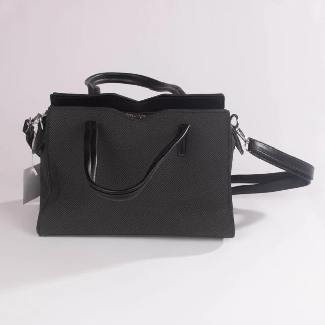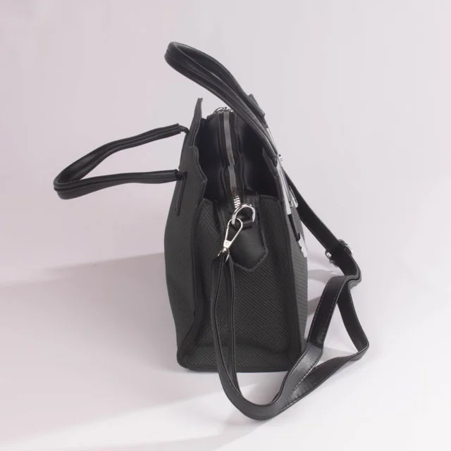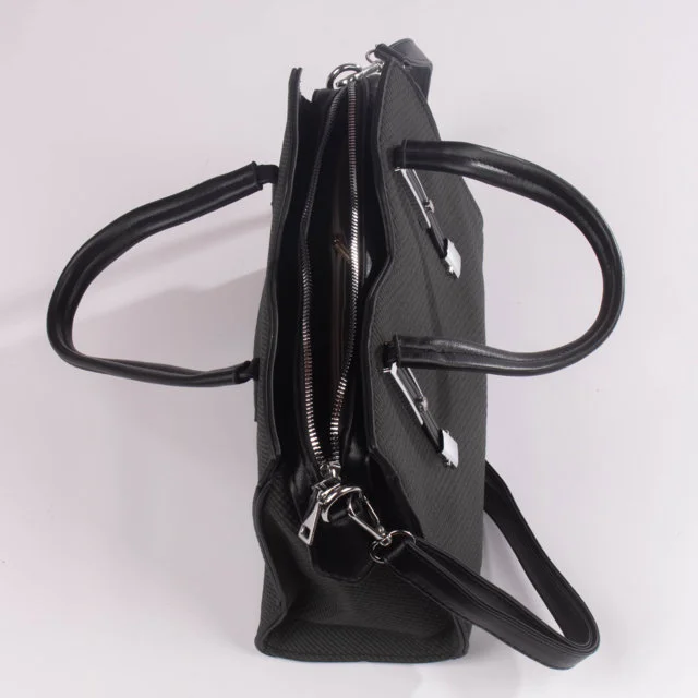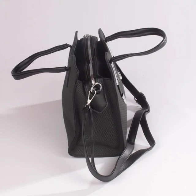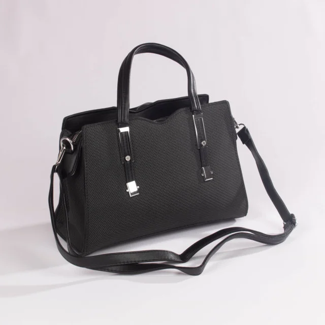 Bolso de mano en color negro con diseño clásico y elegante. Cuenta con doble asa resistente y correa larga ajustable y removible, lo que permite llevarlo tanto en la mano como en el hombro. Su estructura firme y acabados en herrajes metálicos plateados lo convierten en un accesorio versátil, ideal para complementar cualquier estilo.