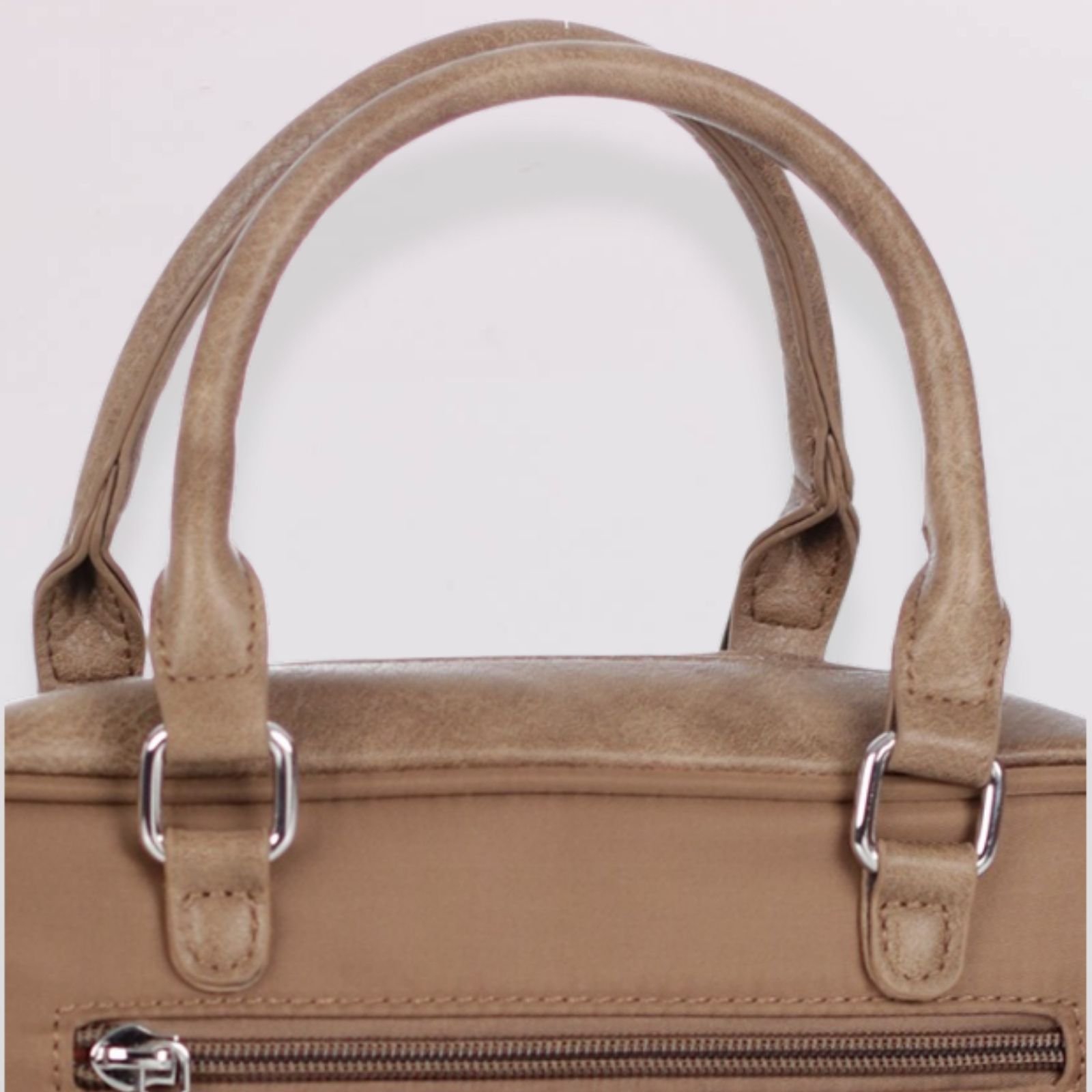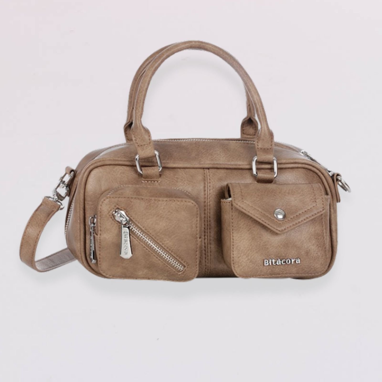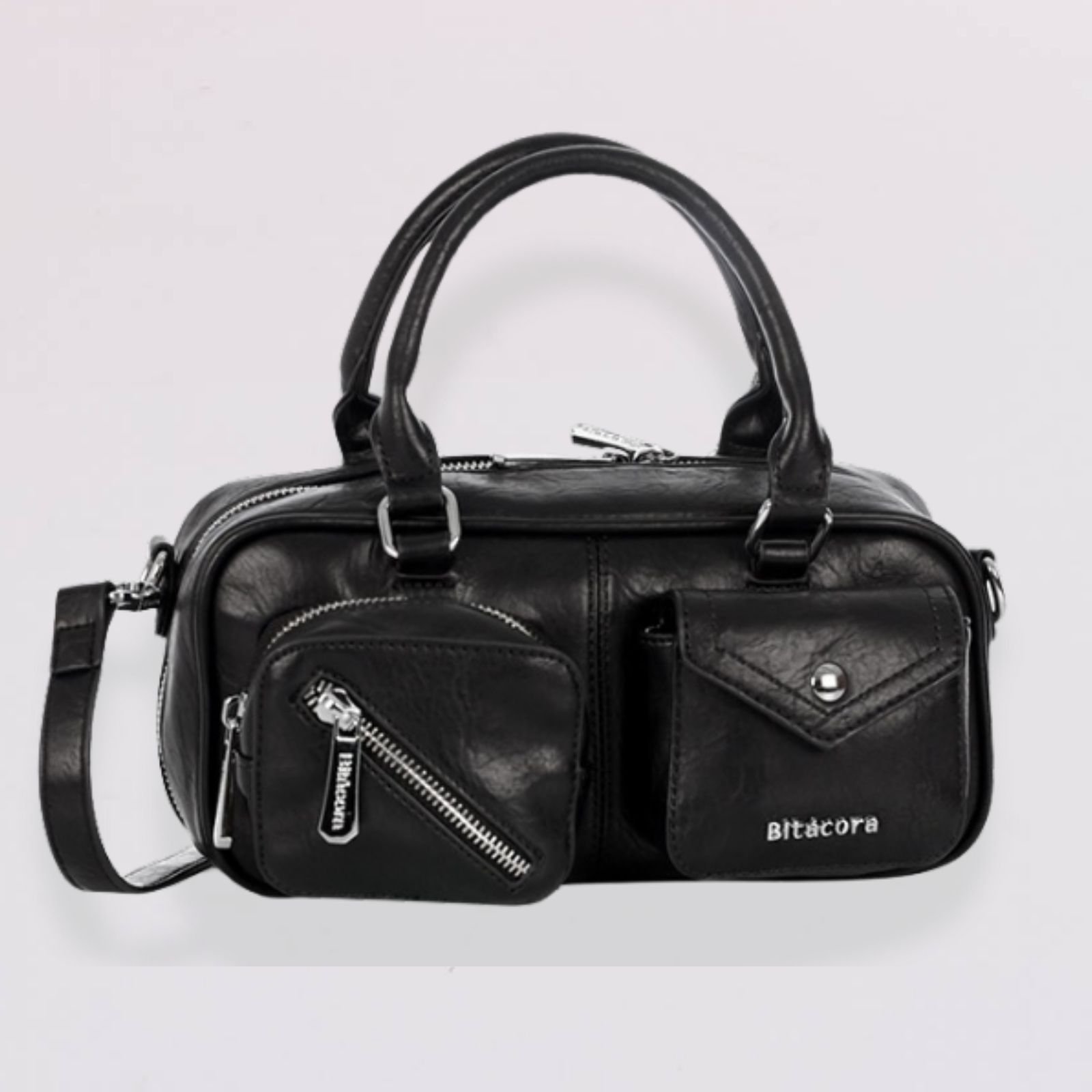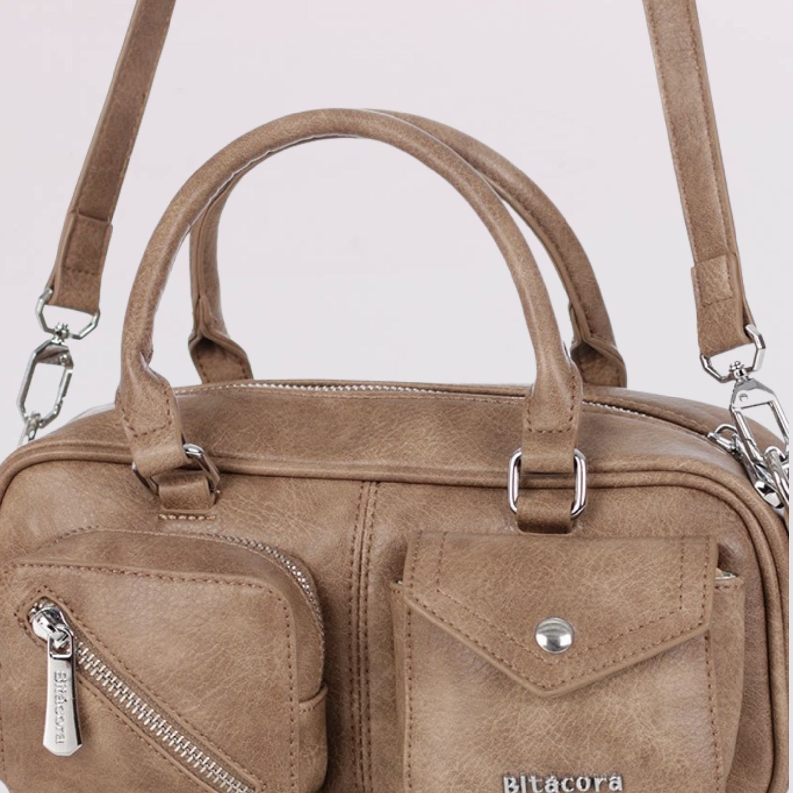 Bolso tipo satchel de diseño moderno y elegante, ideal para uso diario o para complementar un look casual. Cuenta con dos bolsillos frontales con cierre de cremallera y solapa decorativa, además de un compartimento principal amplio que permite organizar artículos personales de forma práctica y segura. Incluye asas superiores y correa ajustable y removible para mayor comodidad.
