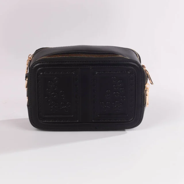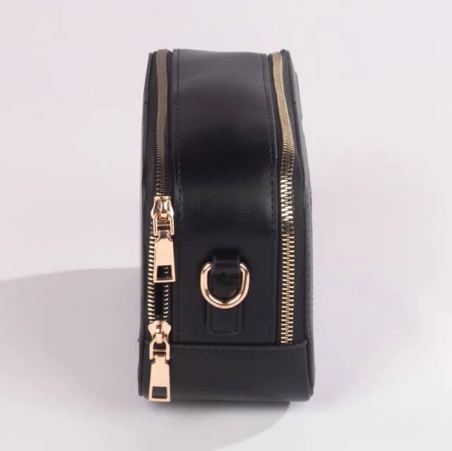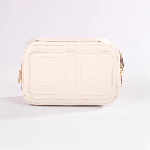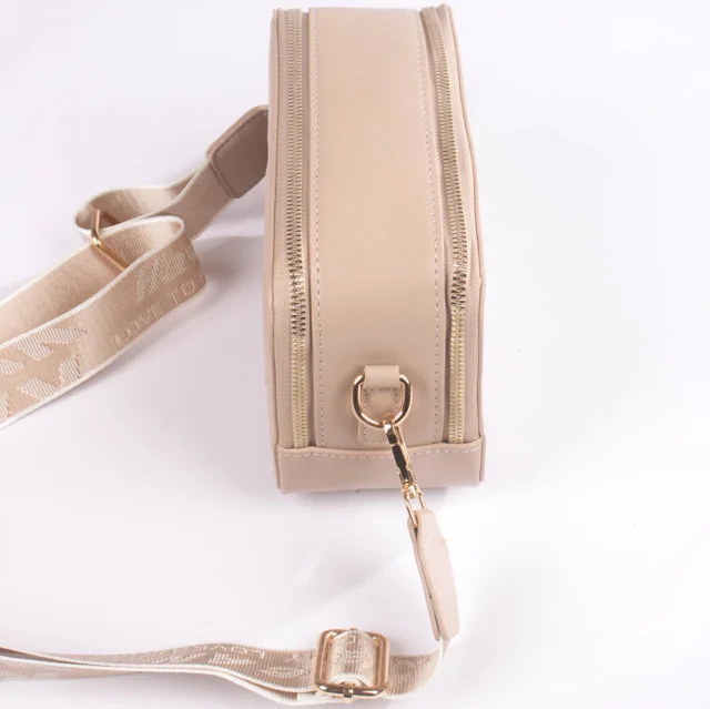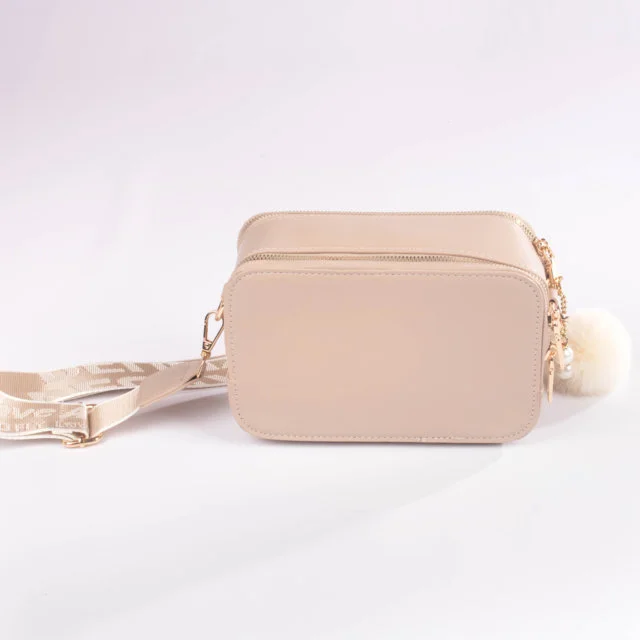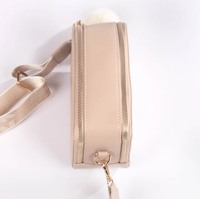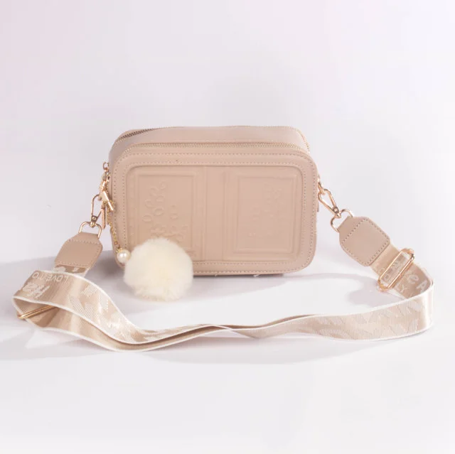 Bolso tipo crossbody disponible en colores negro, beige y crema. De diseño compacto y moderno, cuenta con correa ancha ajustable y removible, ideal para llevarlo al hombro o cruzado. Incluye detalles decorativos y un llavero de pompón en algunas versiones, aportando un toque juvenil y versátil.