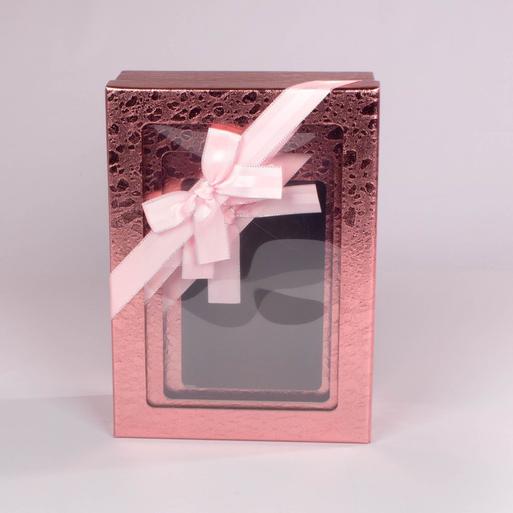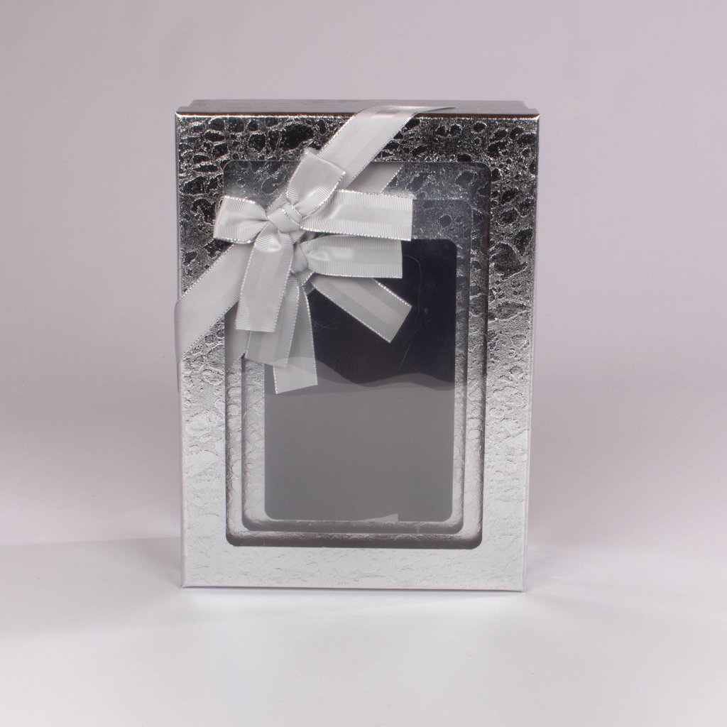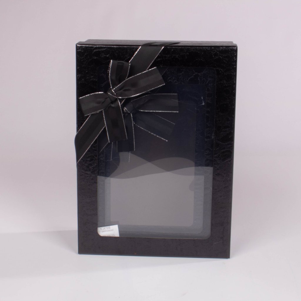Material: Cartón rígido forrado en papel decorativo con acabado brillante y cinta de tela con aplique central.