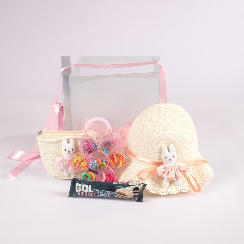 El Combo Bunny Princess es un regalo encantador y delicado, perfecto para las niñas que aman los accesorios tiernos y con estilo. Incluye un hermoso set de bolso y sombrero decorados con un conejito, un set de accesorios para el cabello lleno de colores vibrantes, un delicioso chocolate Gol Rigo y una tarjeta personalizada para crear un mensaje especial.