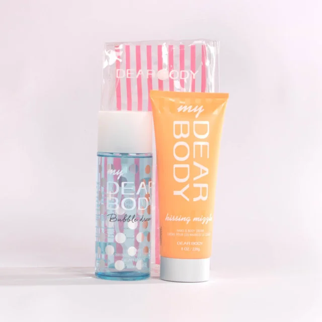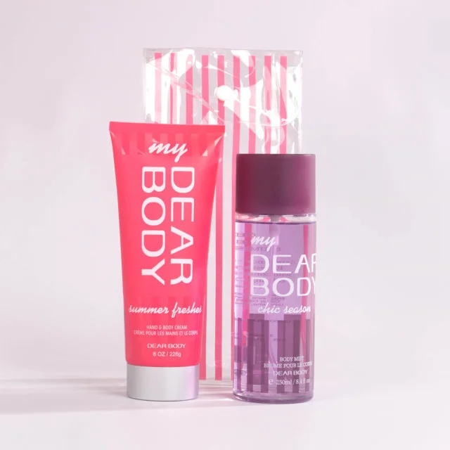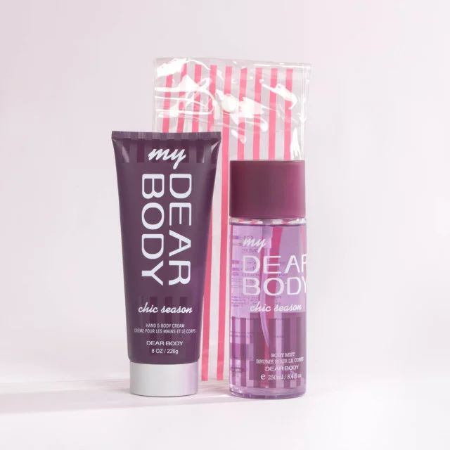 Set de cuidado personal en tamaño estándar que combina fragancia duradera e hidratación profunda. Incluye un body splash de 250 ml y una crema corporal de 250 ml, empacados en un práctico estuche transparente con diseño a rayas. Ideal para el uso diario o como regalo especial.