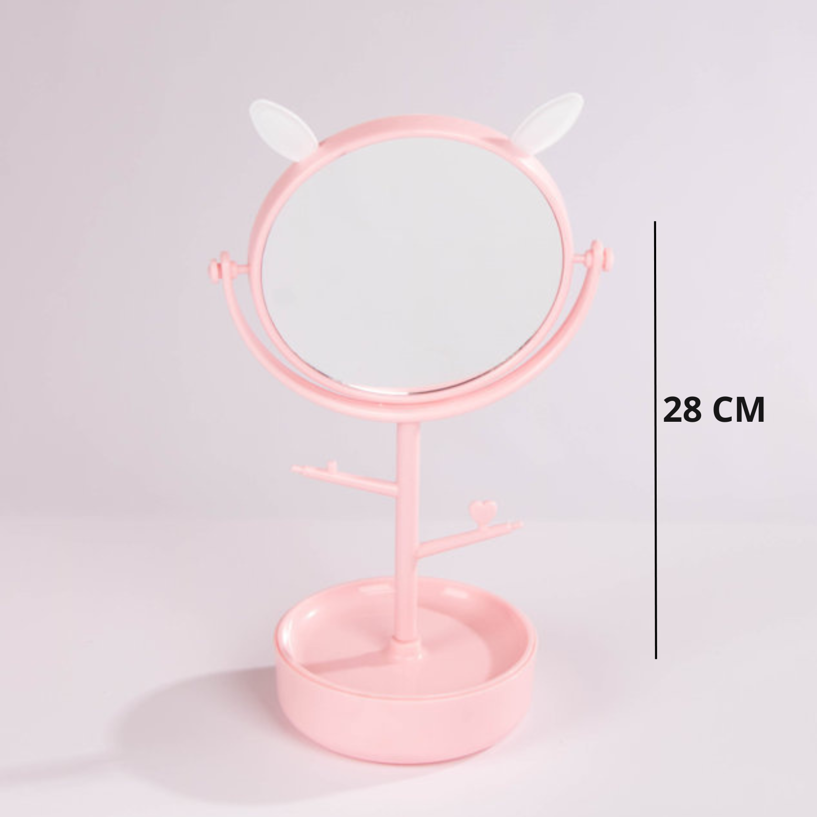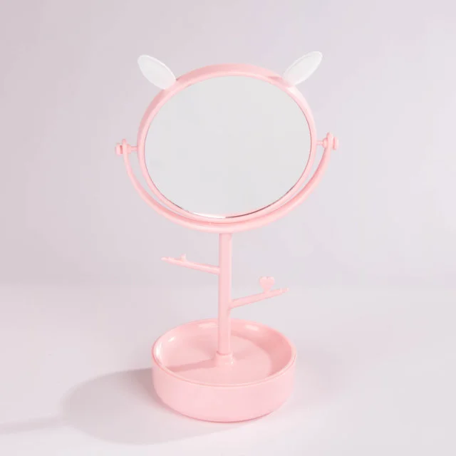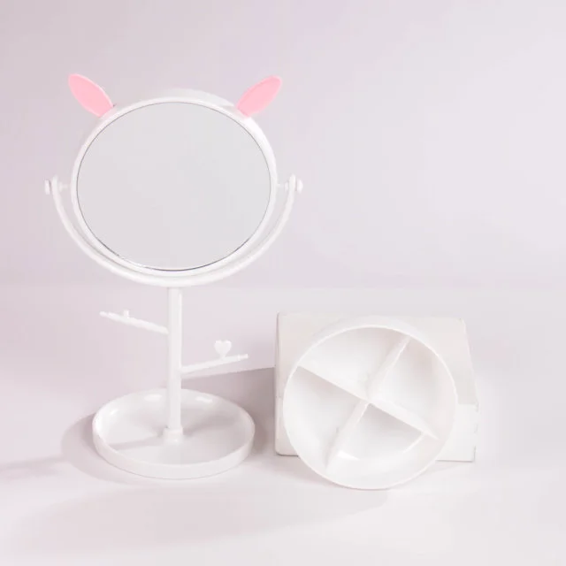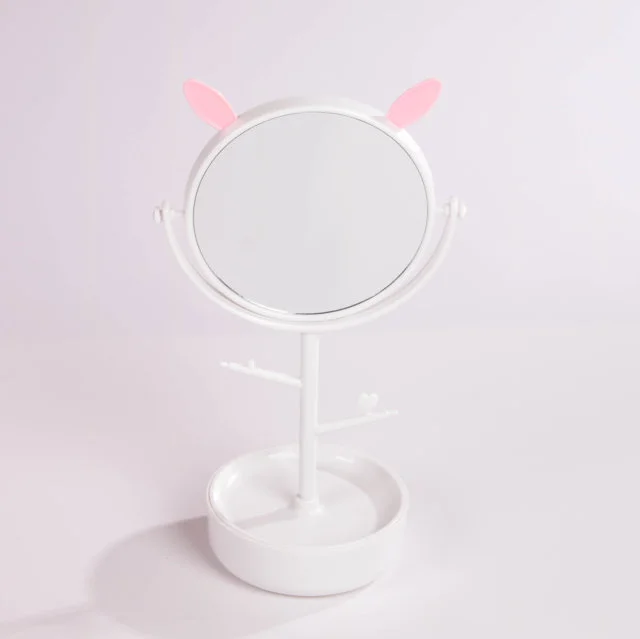 Práctico espejo de tocador con soporte integrado para organizar accesorios como joyas, brochas, cosméticos o pequeños objetos personales. Tamaño 28cm, ideal para escritorios, tocadores o baños. Su diseño funcional y moderno está disponible en dos colores, lo que permite combinarlo fácilmente con diferentes estilos de decoración. Compacto, estable y fácil de limpiar.