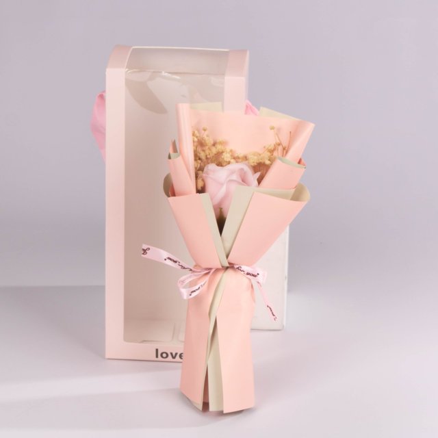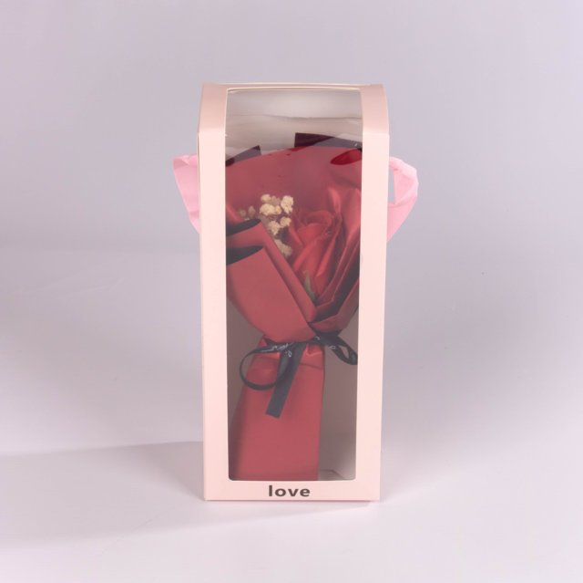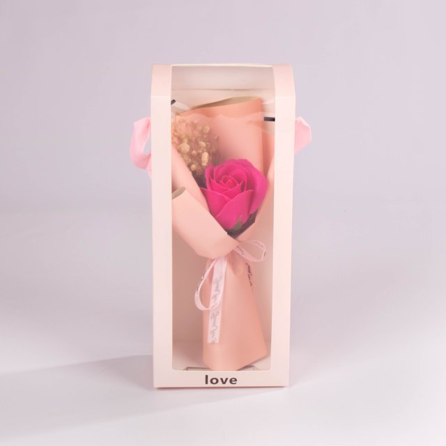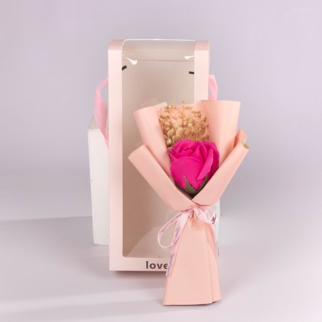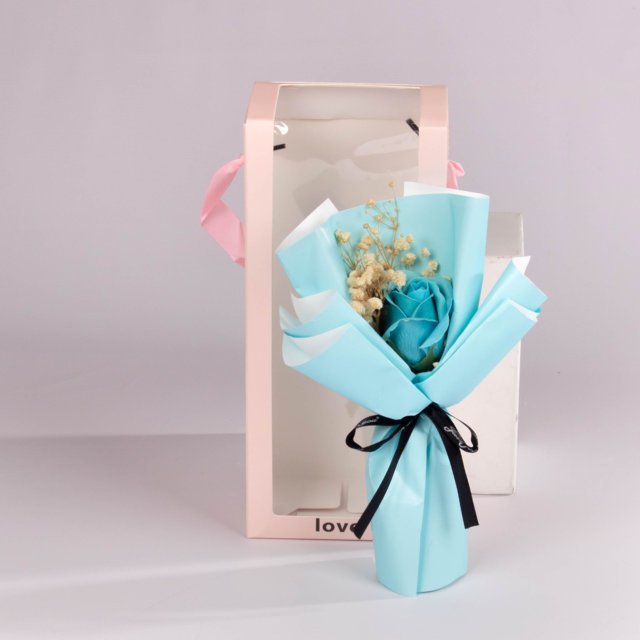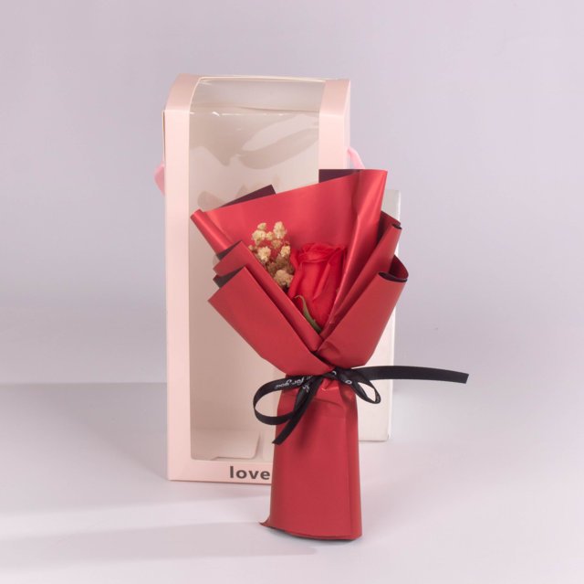 Cada flor viene cuidadosamente empacada en una elegante bolsa blanca con ventana frontal, lista para obsequiar o decorar tus espacios. Su diseño combina pétalos realistas, cintas de tela y un toque floral que ilumina cualquier rincón del hogar u oficina.