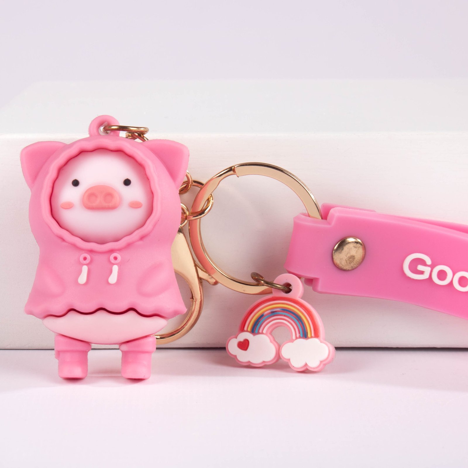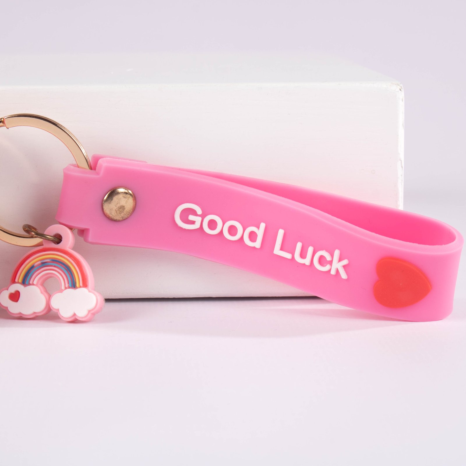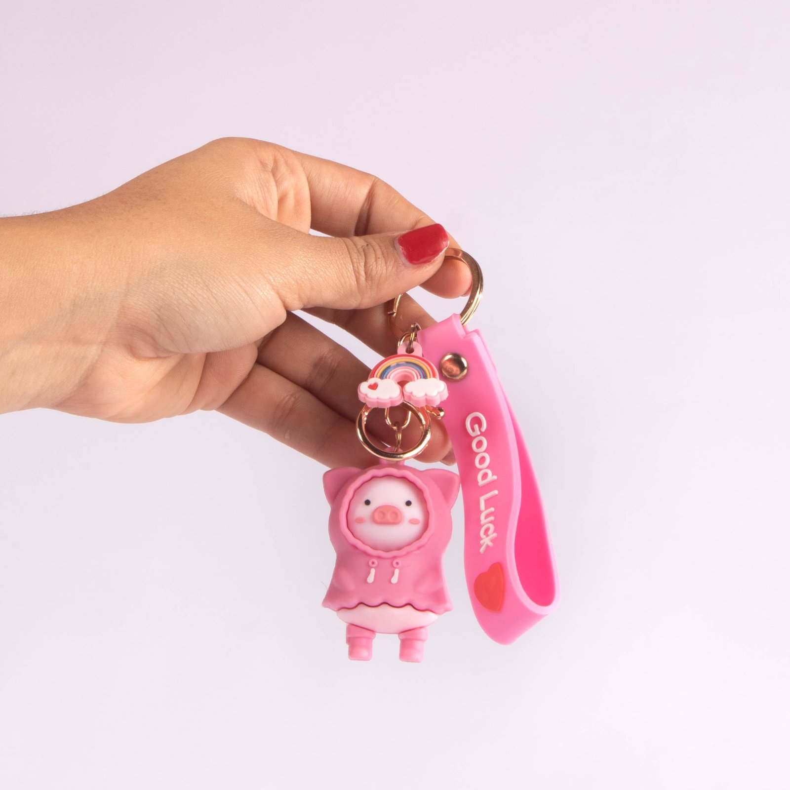 Tierno llavero con figura de cerdito en tono rosado, acompañado de una cinta decorativa con el mensaje “Good Luck” y un pequeño dije de arcoíris. Su diseño encantador lo hace ideal para decorar bolsos, mochilas, llaves o regalar como detalle especial. Combina un estilo adorable con un mensaje positivo que transmite buena suerte y alegría.