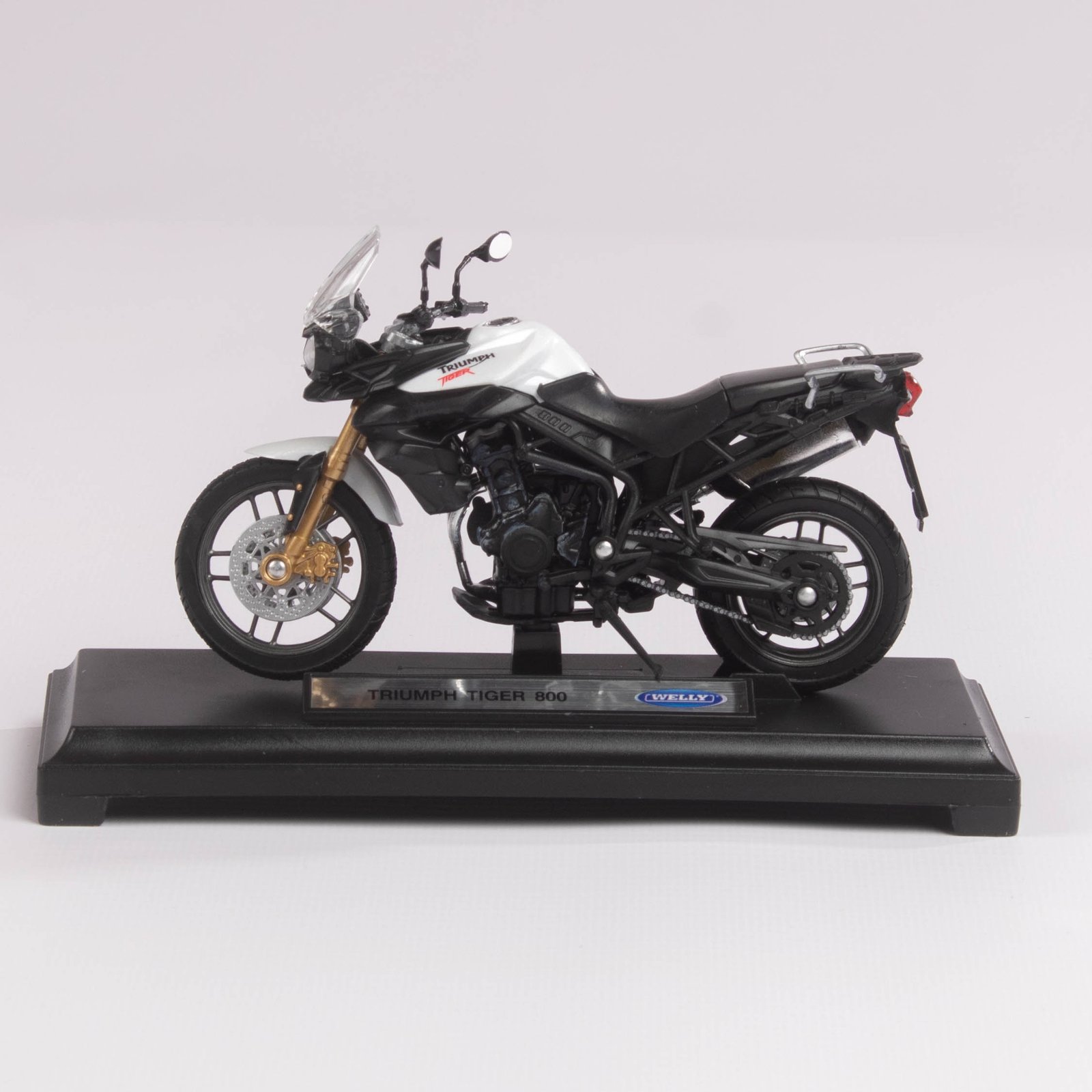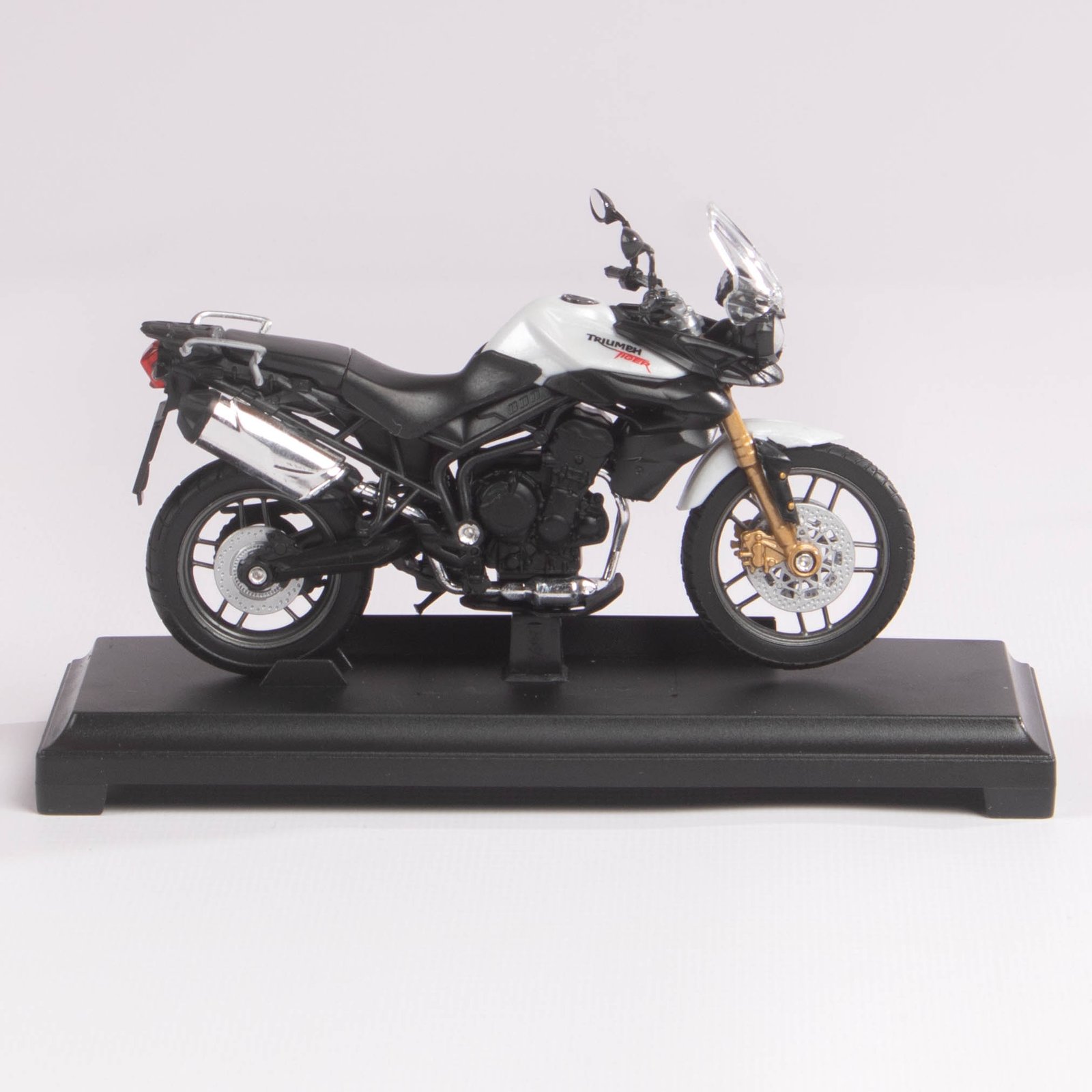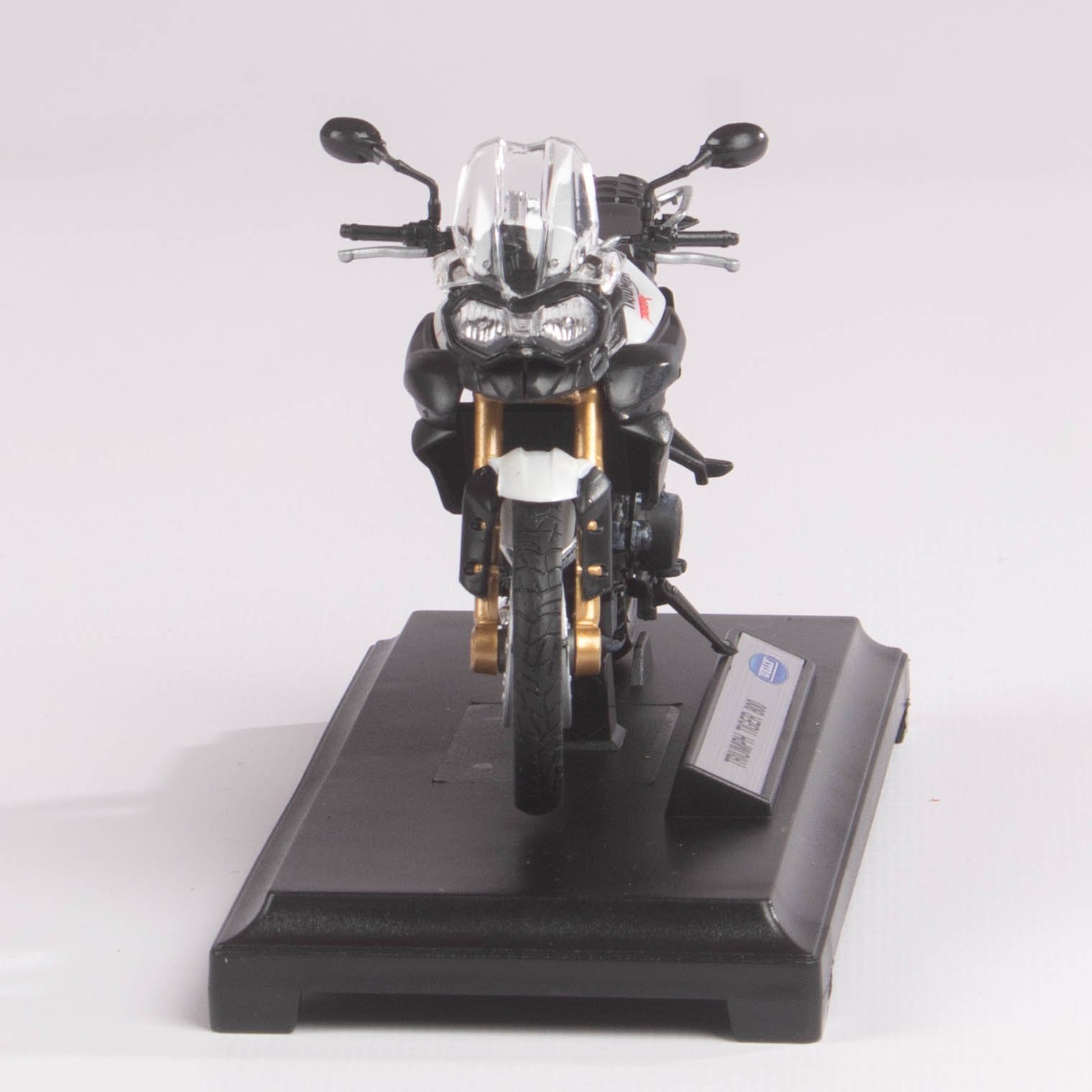 Replica a escala de la icónica motocicleta Triumph Tiger 800, reconocida por su diseño aventurero y estilo touring. Con acabados realistas y detalles fieles a la original, es un modelo ideal para coleccionistas de motos clásicas y de aventura.