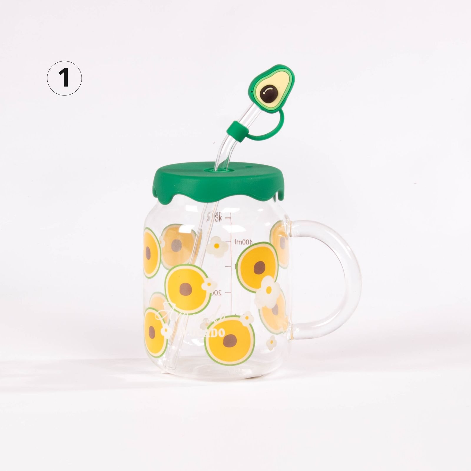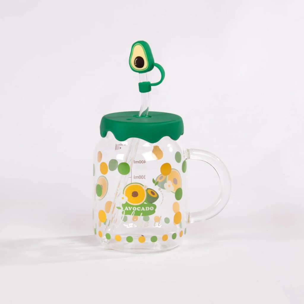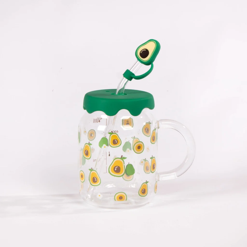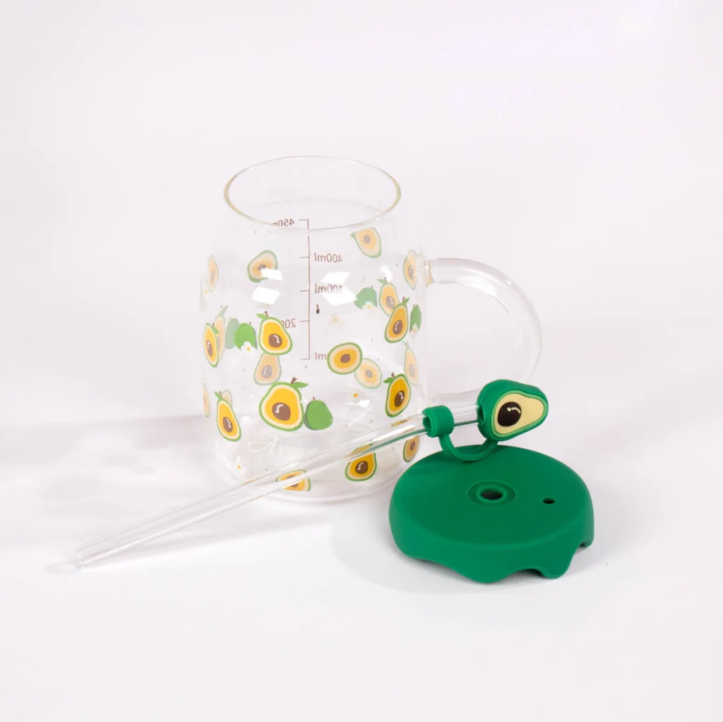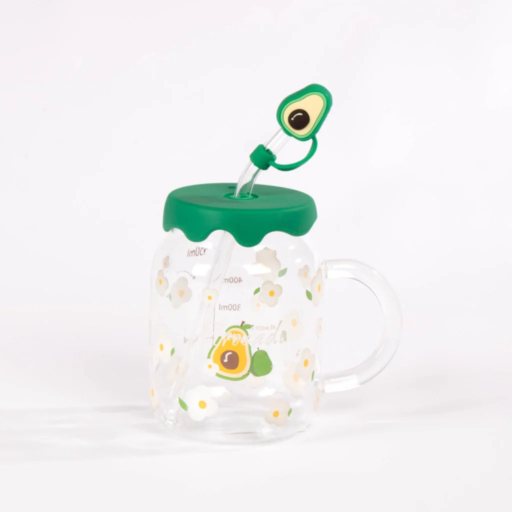 Moderno mug de vidrio con diseño de aguacate, perfecto para quienes disfrutan de un estilo fresco y actual. Disponible en colores suaves que complementan su apariencia delicada, este mug es ideal para bebidas frías o calientes gracias a su capacidad de 600 ml y sus accesorios reutilizables.