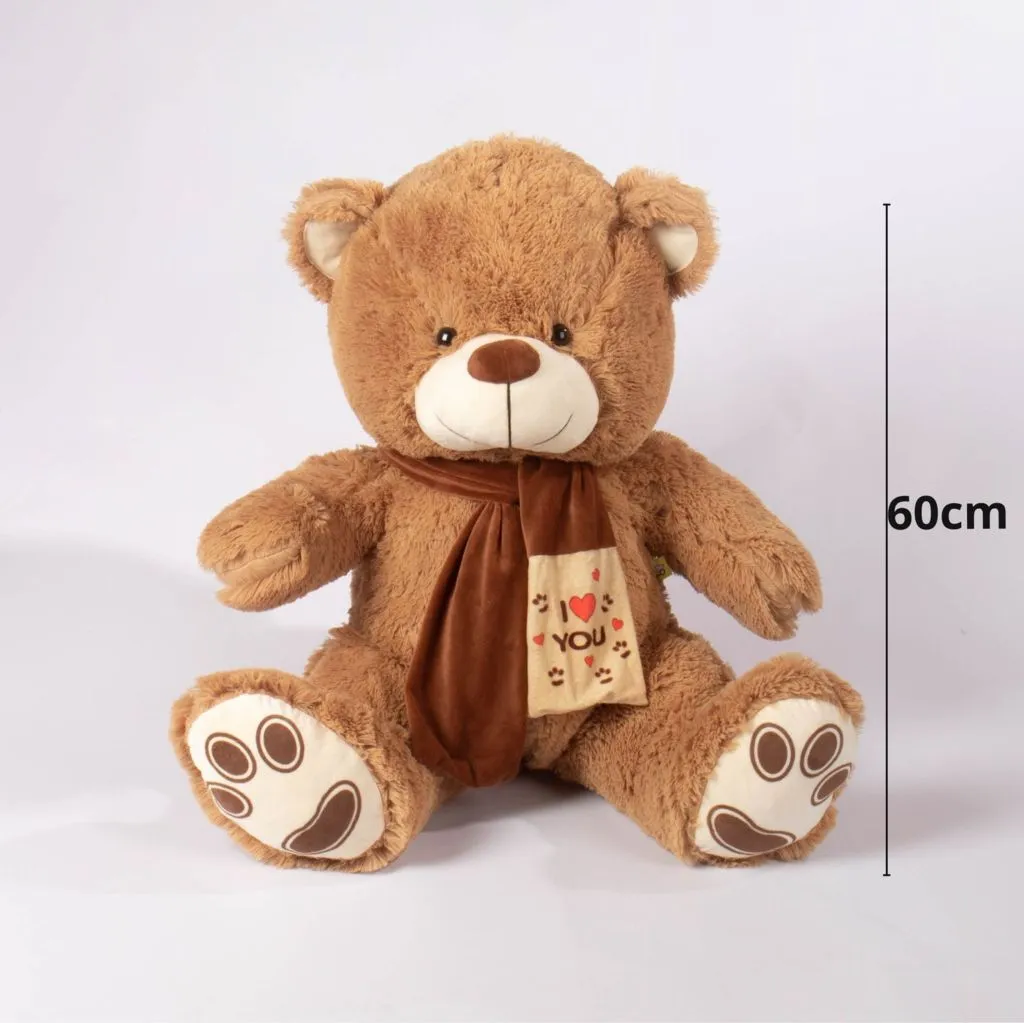 Este tierno peluche de oso con bufanda, disponible en 4 hermosos colores, está listo para darle un toque acogedor a cualquier espacio. Su tamaño de 60 cm lo hace perfecto para abrazar y usar como pieza decorativa en habitaciones o salas. ¡Ideales para regalar y sorprender en cualquier ocasión!