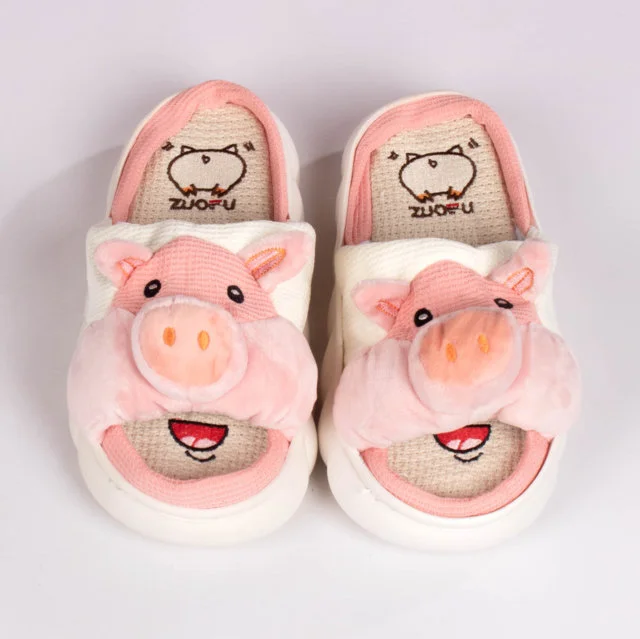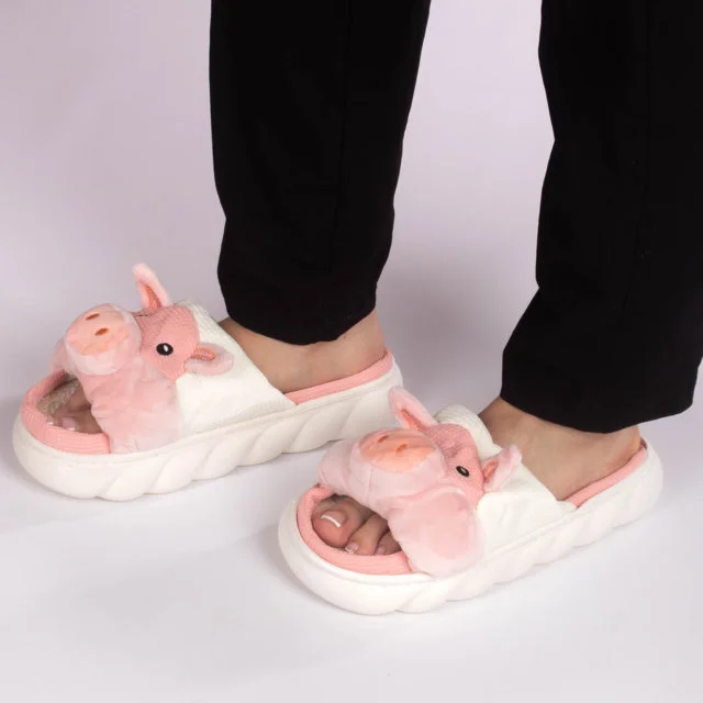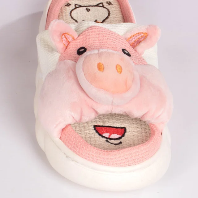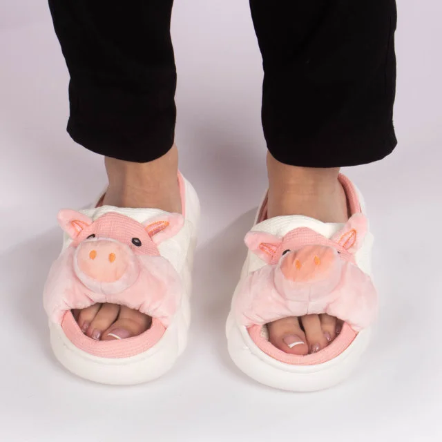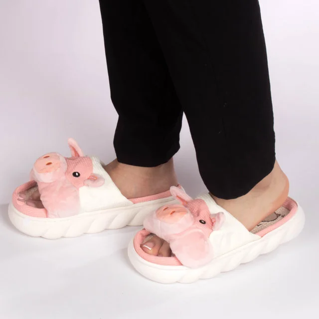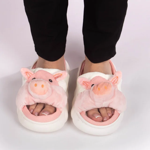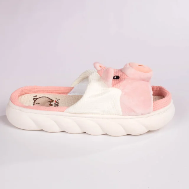 Pantuflas abiertas con un tierno diseño de cerdito en 3D que sobresale en la parte frontal, incluyendo orejitas, hocico y expresión sonriente. Su combinación de colores rosa, blanco y detalles en coral las hace adorables y llamativas, contiene suela blanca antideslizante y resistente, recomendamos elegir tus pantuflas dos tallas por encima de tu talla habitual de calzado.