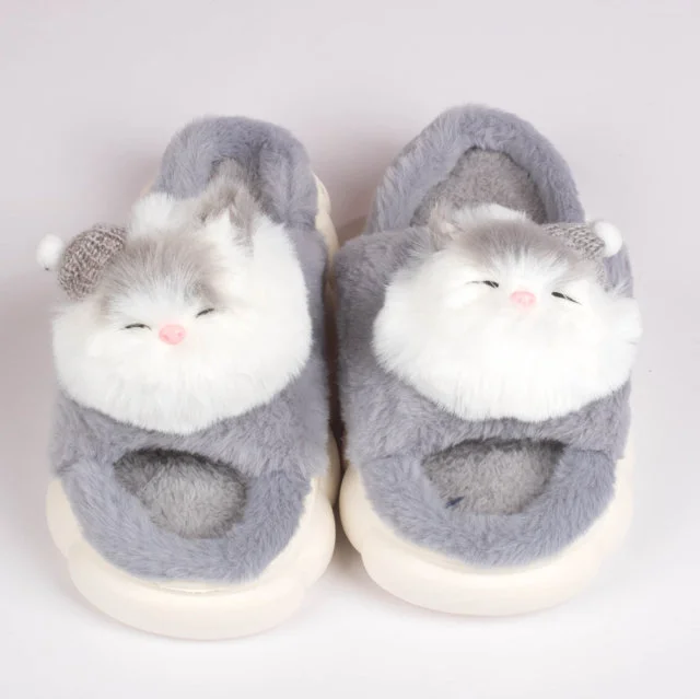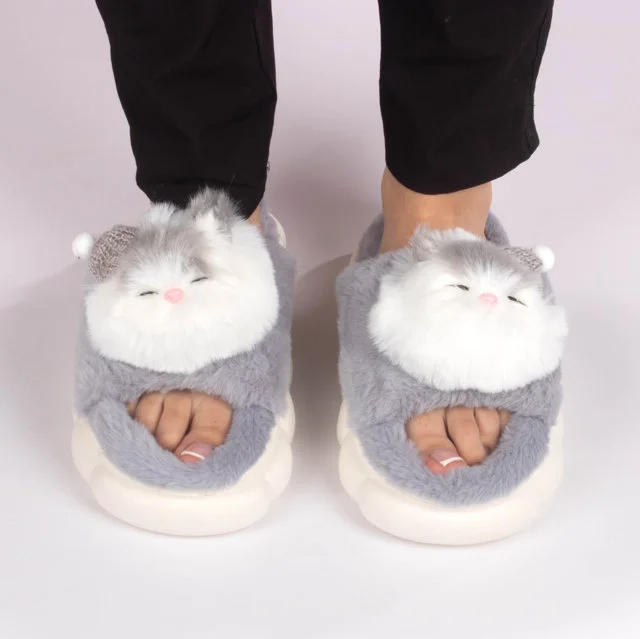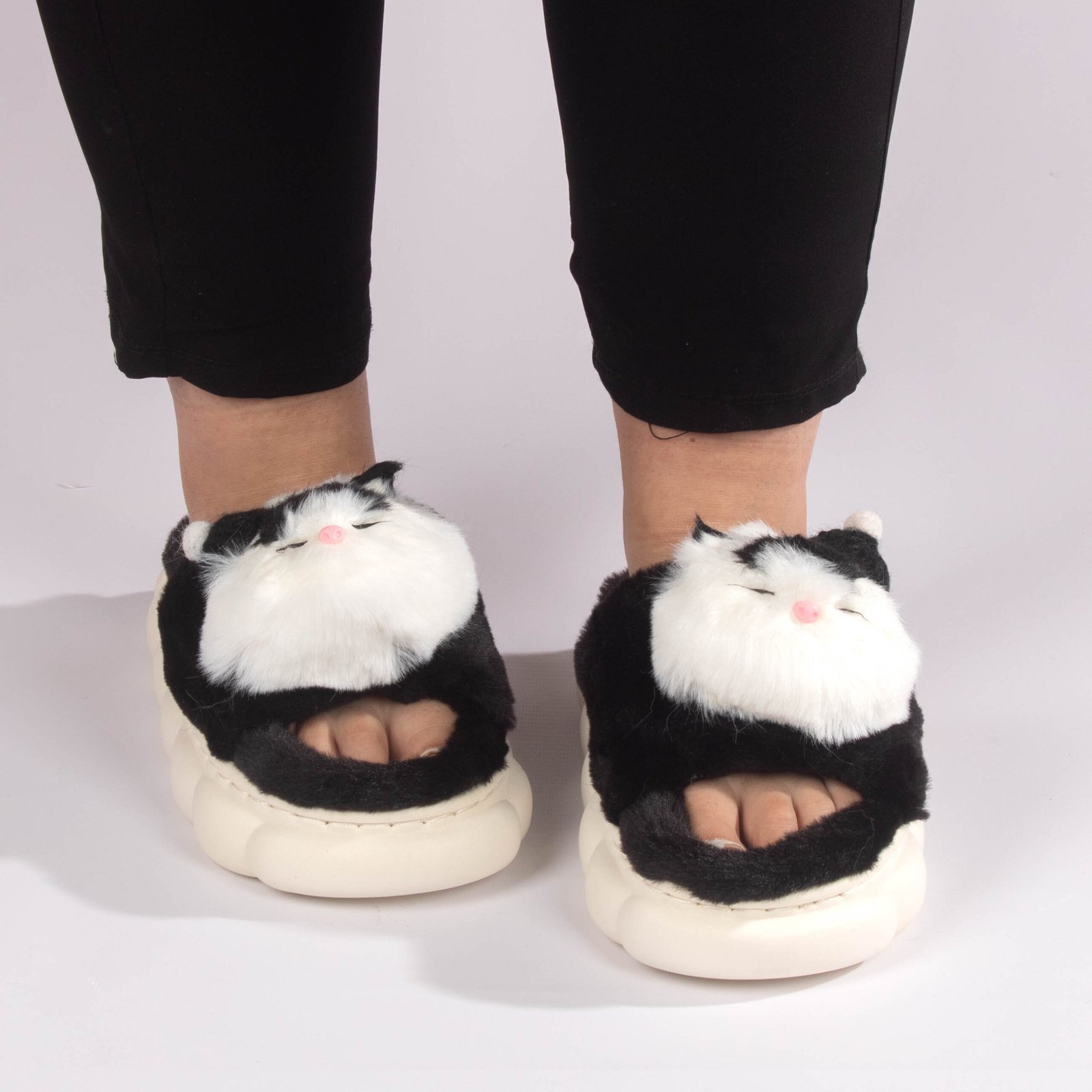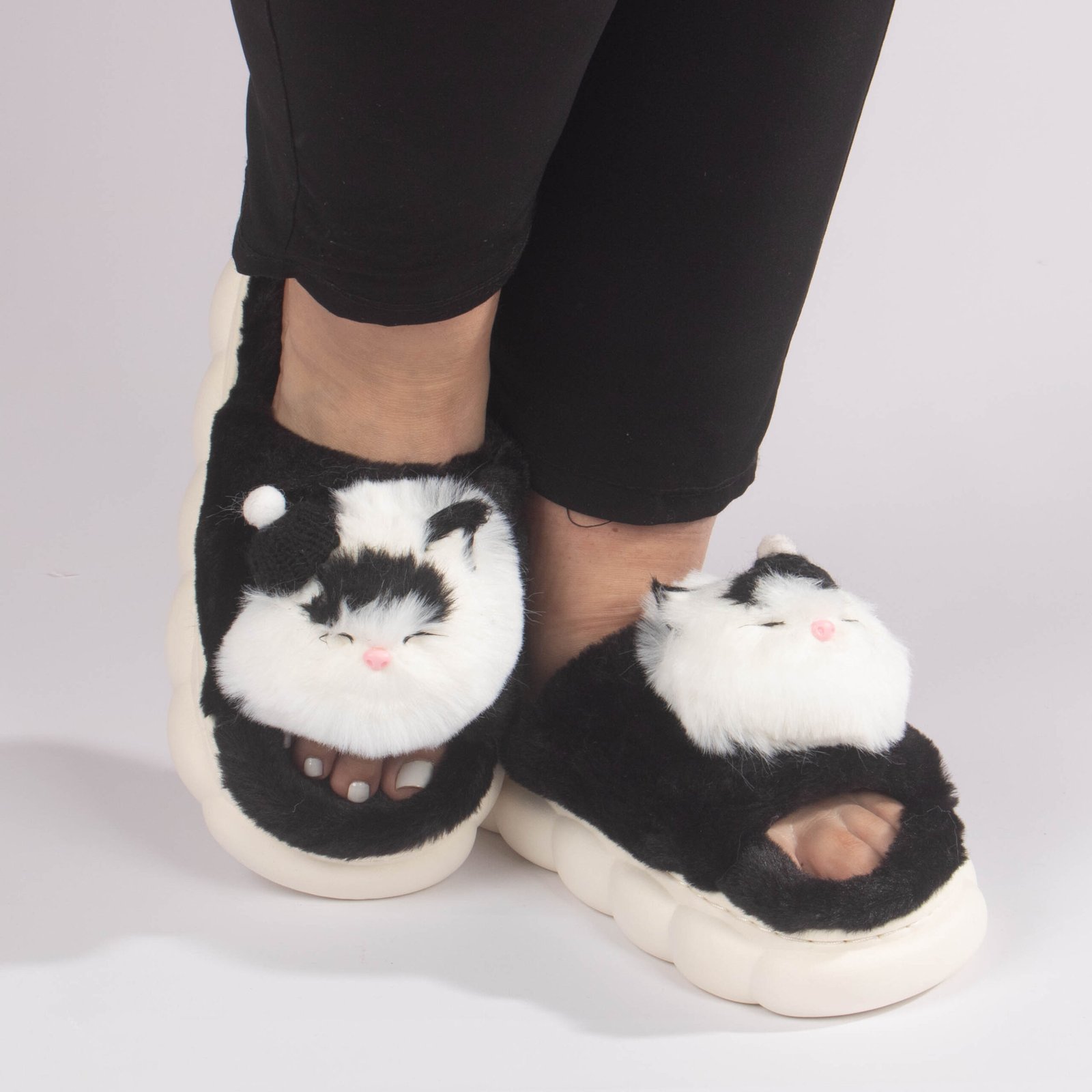 Pantuflas abiertas con un encantador diseño de gatito dormido en 3D, disponible en 3 colores: Gris, Rosado y Negro, recomendamos elegir tus pantuflas dos tallas por encima de tu talla habitual de calzado.
