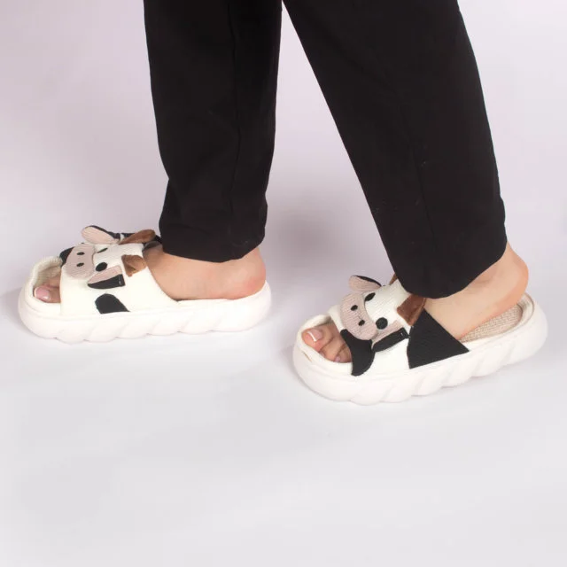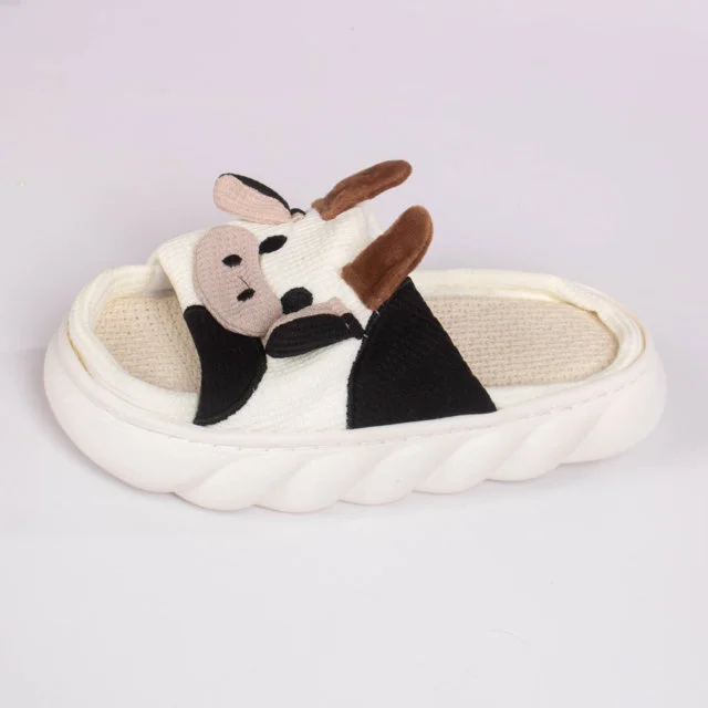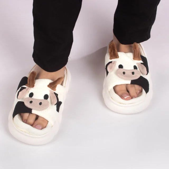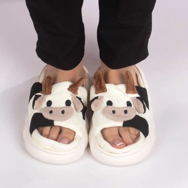 Divertidas y originales pantuflas abiertas con diseño de vaquita. Están confeccionadas en tela suave y acolchada, Su diseño abierto permite mantener los pies frescos mientras se disfruta de la comodidad. La suela blanca antideslizante brinda seguridad al caminar, recomendamos elegir tus pantuflas dos tallas por encima de tu talla habitual de calzado.