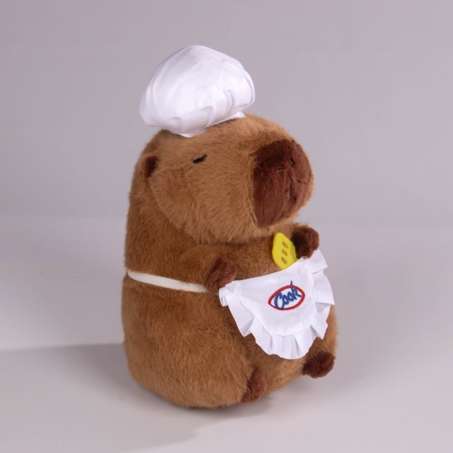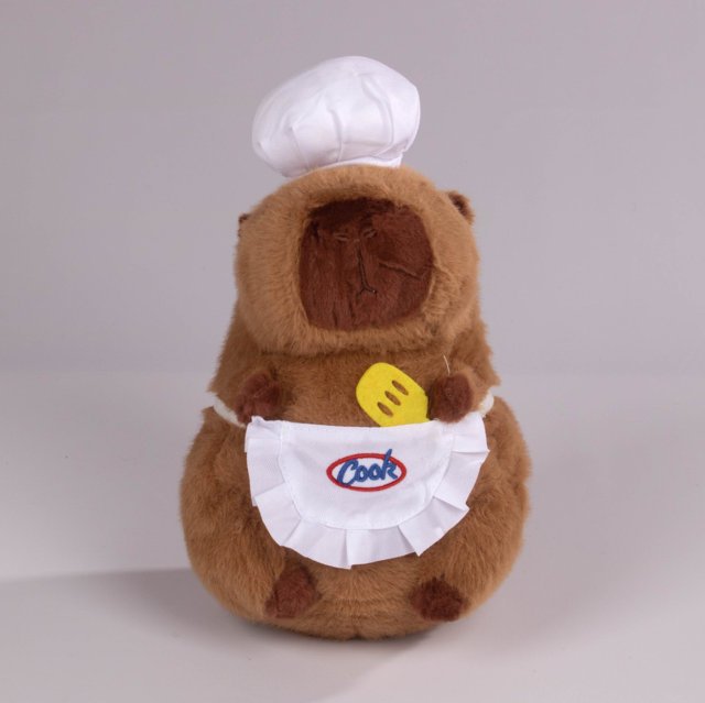 ¡El chef más tierno llegó a tu colección! Este adorable peluche de capibara viste un gorro de cocinero blanco y un delantal con detalles en amarillo, perfecto para los amantes de la cocina o quienes disfrutan de los peluches con temática divertida.