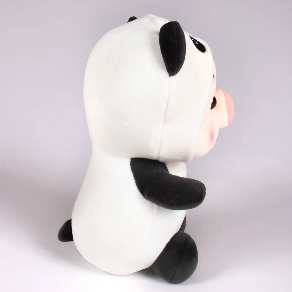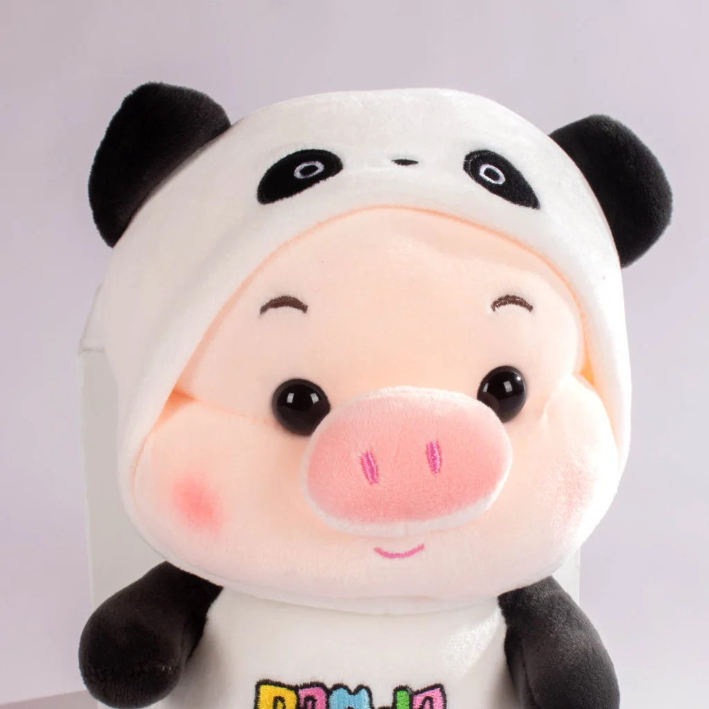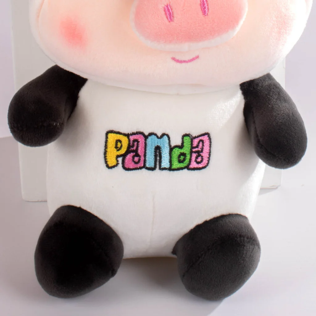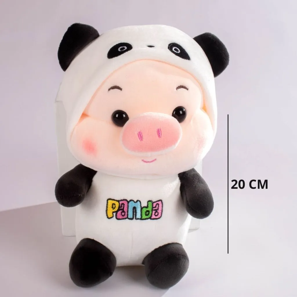Este adorable peluche de cerdito está vestido con un tierno traje de panda. El disfraz es blanco con detalles negros en las orejas, brazos y piernas, e incluye una capucha con el rostro de un panda. En el pecho, luce la palabra “Panda” en letras coloridas. Su expresión tierna y mejillas sonrojadas lo convierten en un regalo encantador y lleno de personalidad.