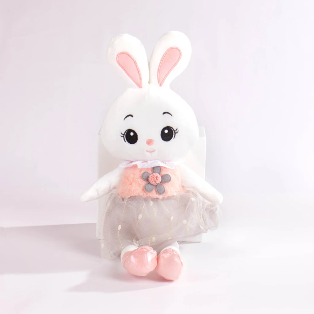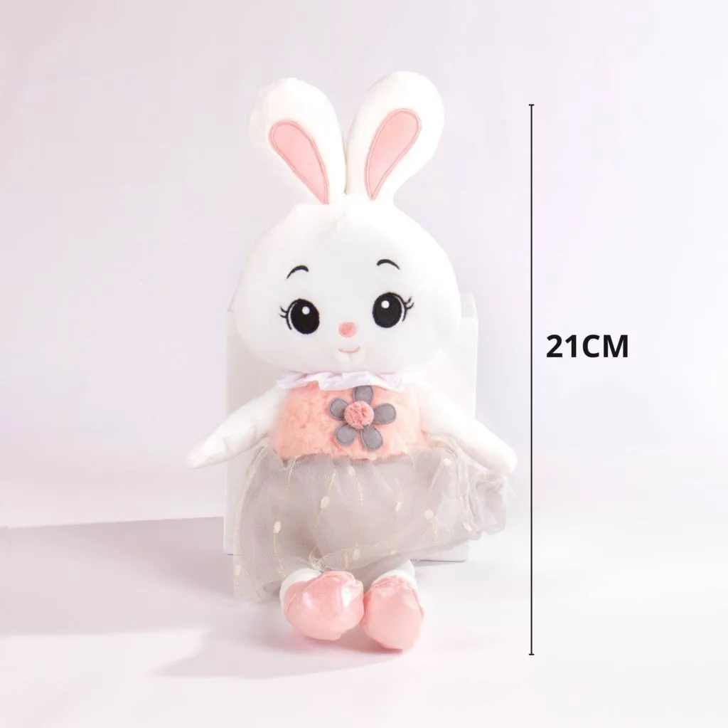 Peluche de conejita de 21 cm con diseño tierno y delicado, elaborado con una combinación de colores suaves y un vestido de tul que aporta elegancia y encanto. Su expresión dulce, orejitas largas y detalles florales la convierten en un accesorio ideal para decorar, regalar o acompañar a los más pequeños. Perfecta para quienes aman los peluches femeninos y llenos de estilo.
