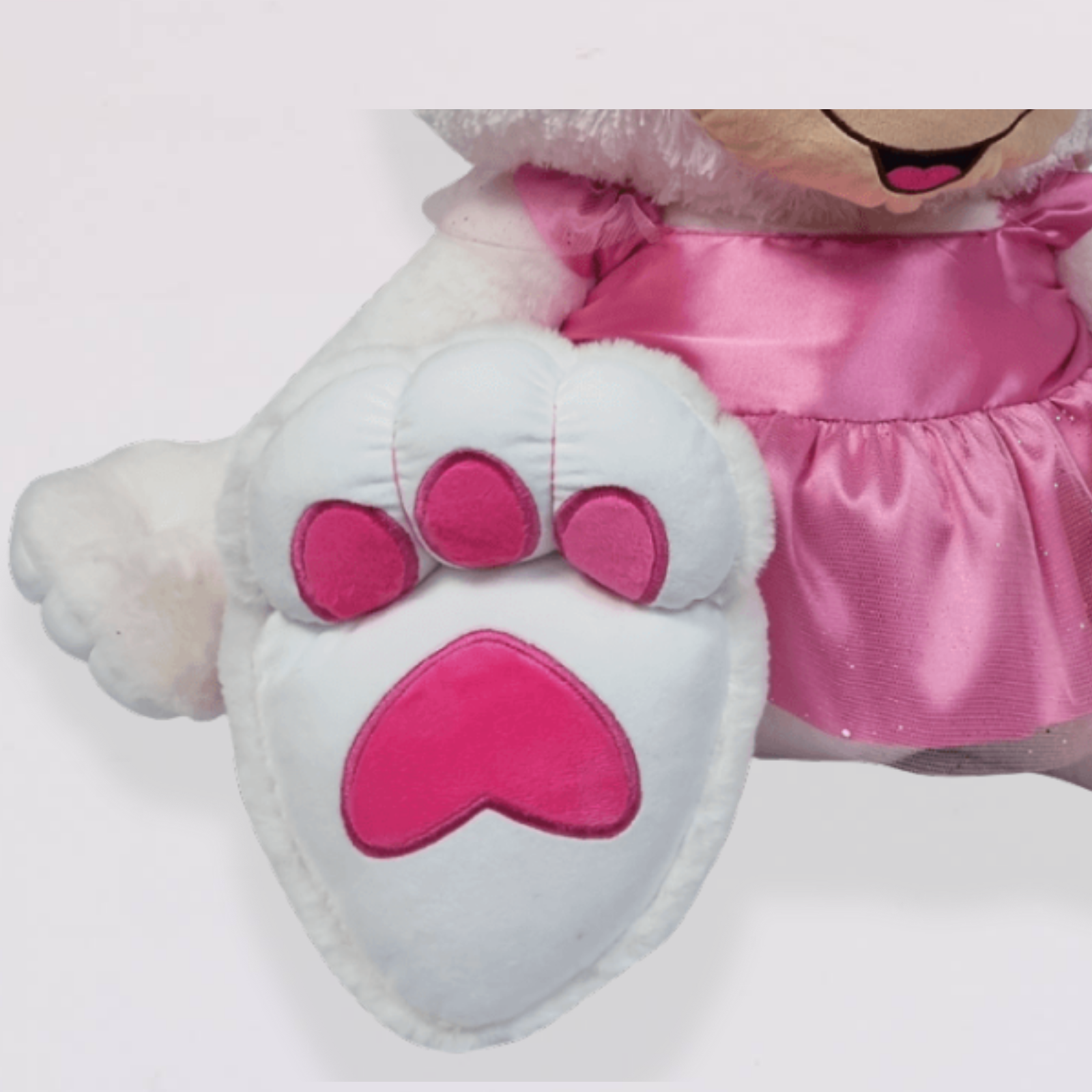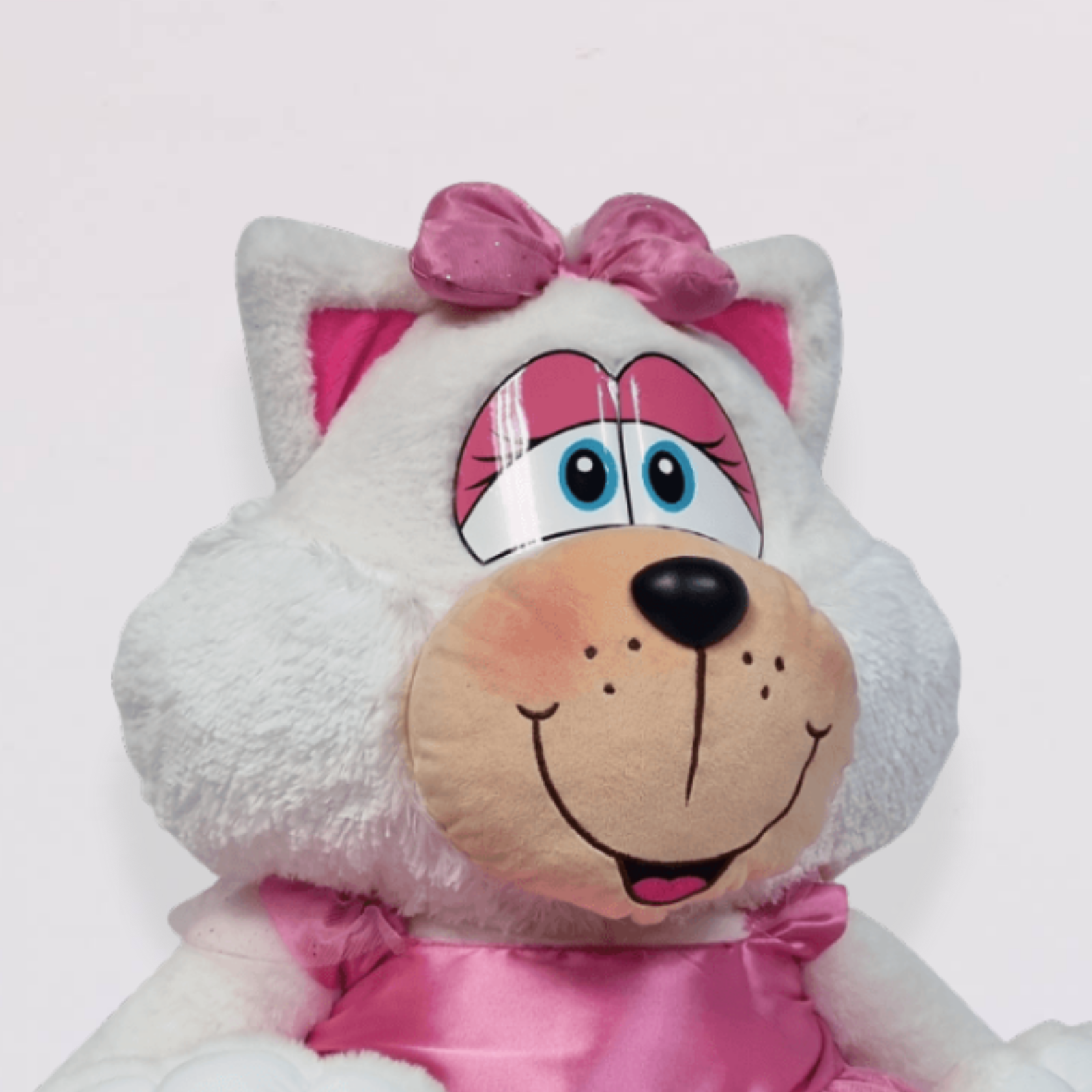 Encantadora gata de felpa vestida con un elegante vestido rosa satinado y lazo en la cabeza. Su diseño combina dulzura y estilo, ideal para quienes aman los detalles tiernos. La Gata Michel destaca por su expresión alegre, sus grandes ojos bordados y sus huellitas rosadas que realzan su ternura.