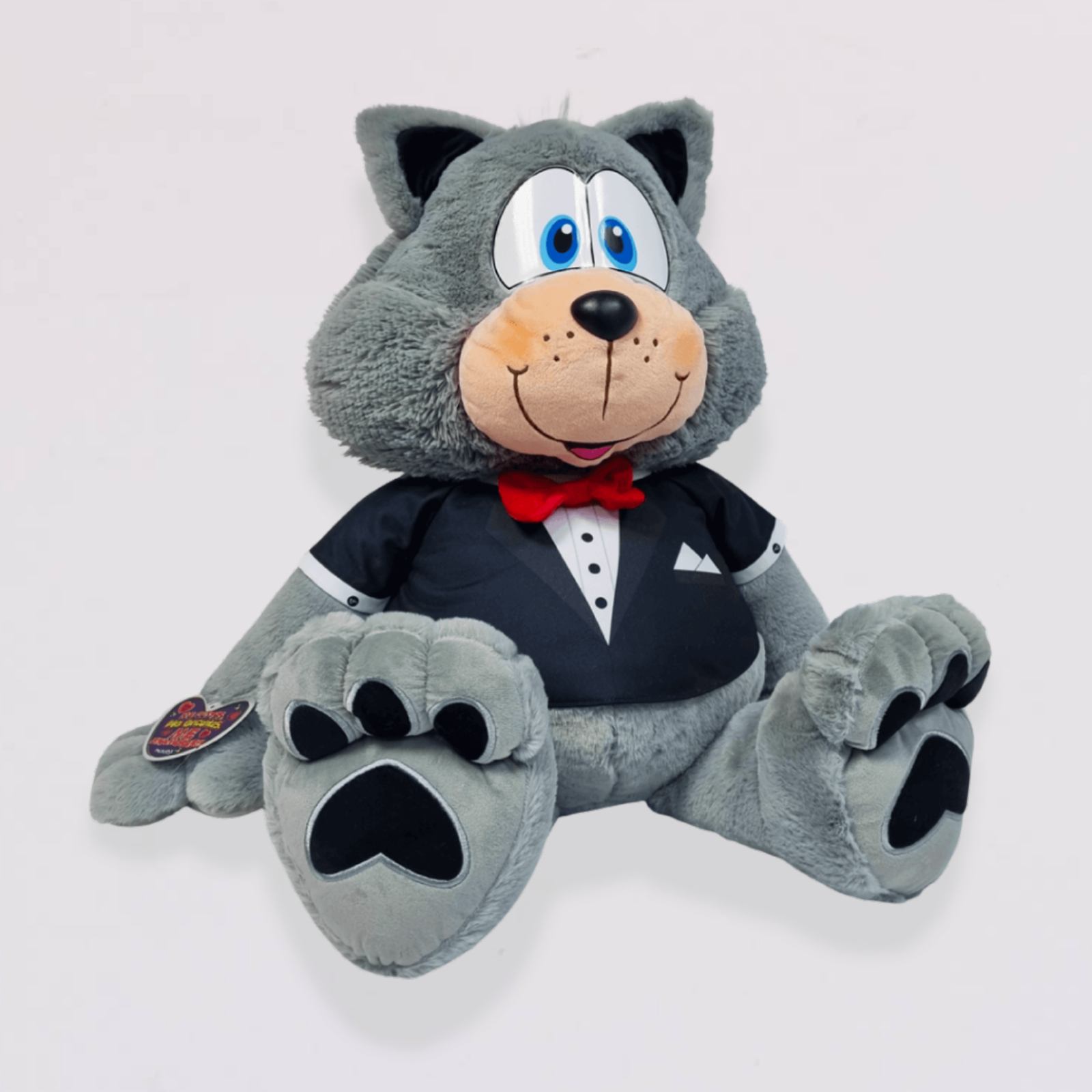 Majestuoso peluche de gato con traje de gala, diseñado con una combinación de elegancia y ternura. Viste un esmoquin negro con camisa blanca y moño rojo, destacando por su gran tamaño y detalles cuidadosamente elaborados. Su expresión simpática y su cuerpo suave lo convierten en el compañero perfecto para regalar o decorar espacios.