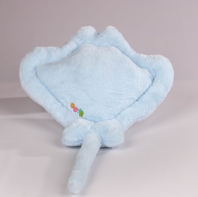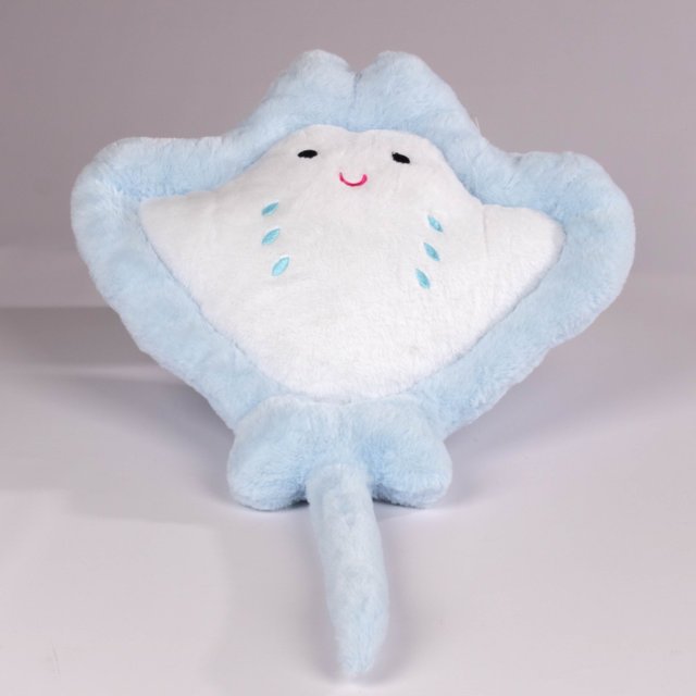 Una adorable mantarraya en tono azul celeste con detalles blancos y faciales bordados que transmite ternura y simpatía. Su diseño plano y alargado con cola extendida lo convierte en un peluche cómodo para abrazar, decorar o coleccionar.