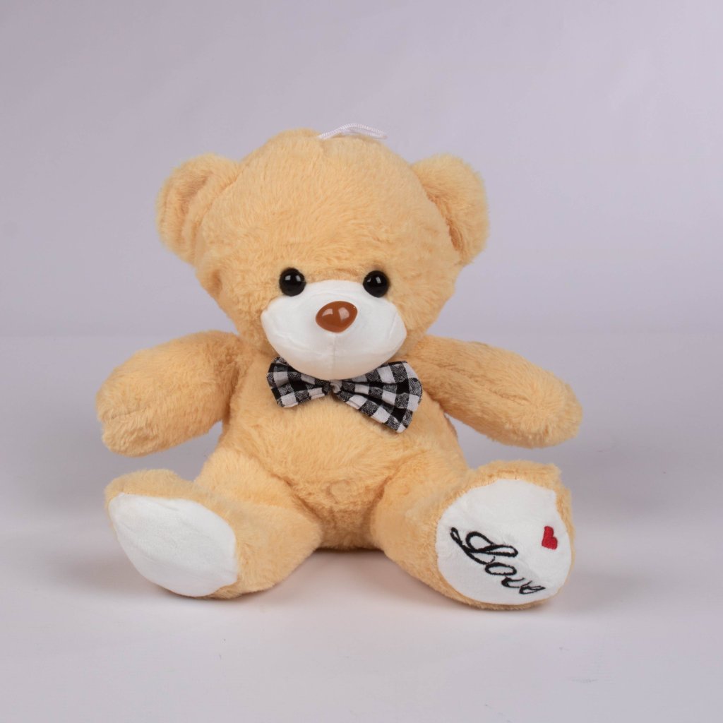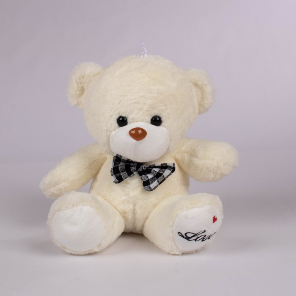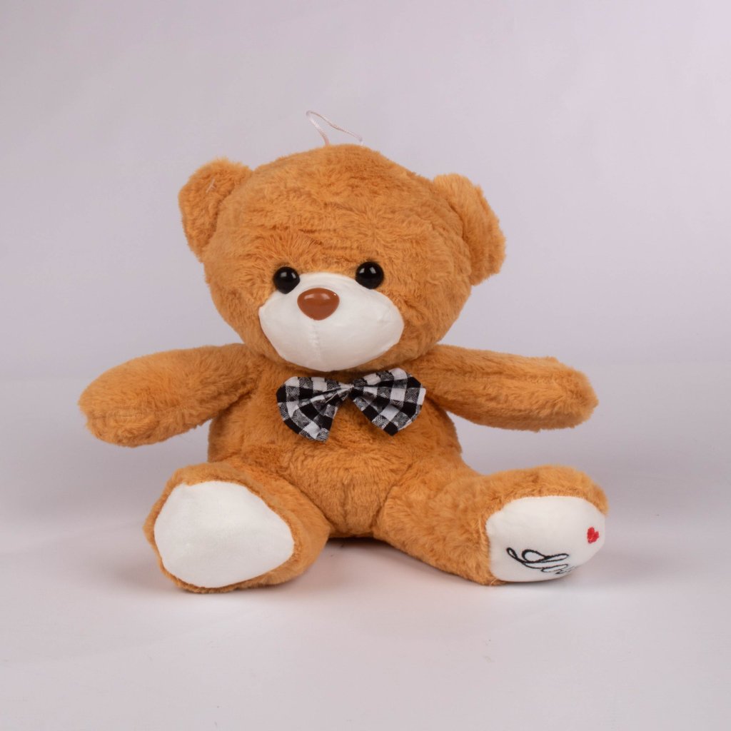 Peluche de oso de 23 cm con diseño clásico y tierno, elaborado en felpa suave de alta calidad. Presenta un moño estampado en cuadros que aporta un toque elegante y adorable. Su tamaño compacto lo convierte en un detalle perfecto para regalos especiales, decoración de habitaciones o como compañía suave y acogedora. Disponible en colores beige, blanco y café.