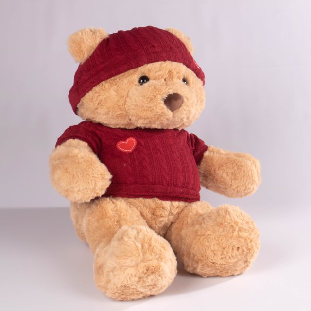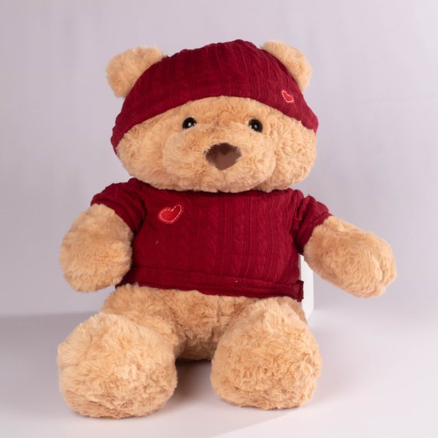 Peluche de oso de 60 cm en color café con un diseño encantador y acogedor. Viste un gorro tipo tejido y una camiseta tipo tejida en color rojo, ambos con bordado de corazón que le aportan un toque romántico y especial. Su gran tamaño lo convierte en un regalo perfecto para sorprender y en una pieza decorativa ideal para habitaciones.