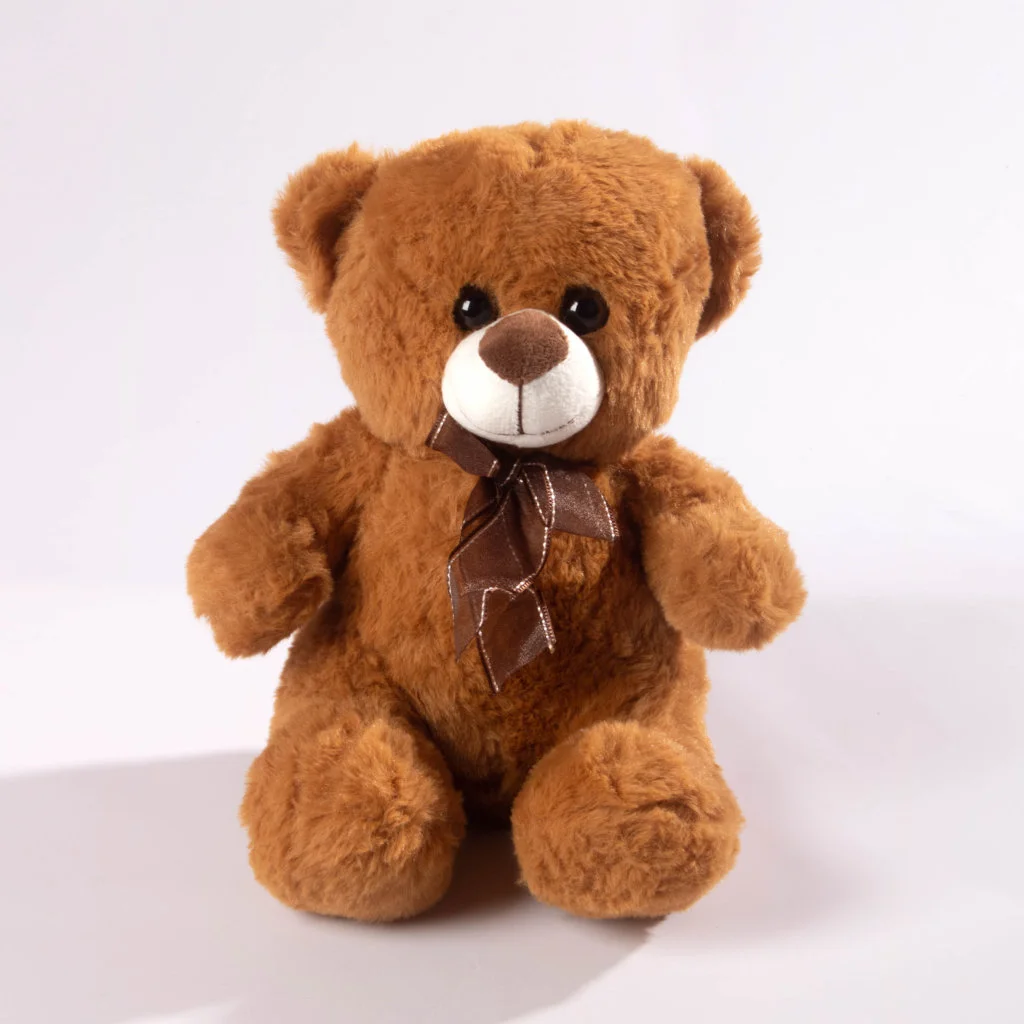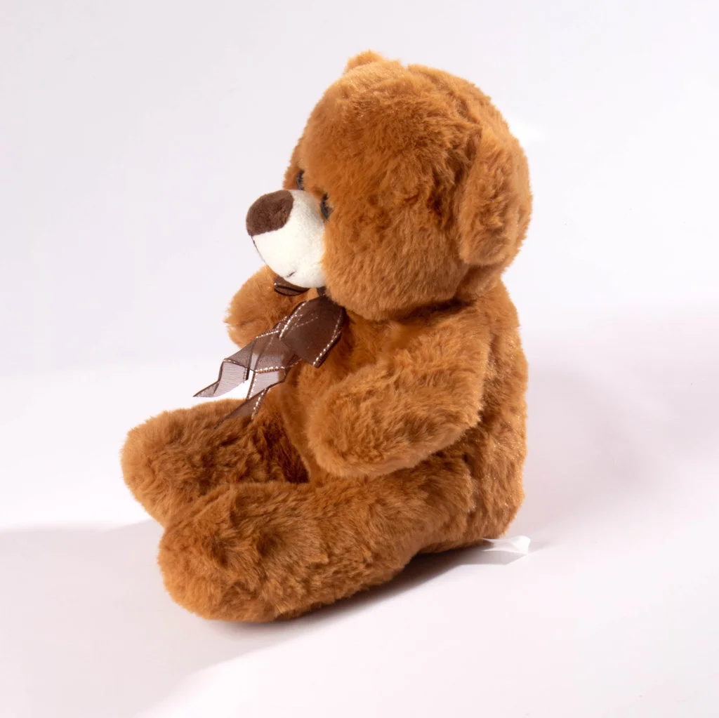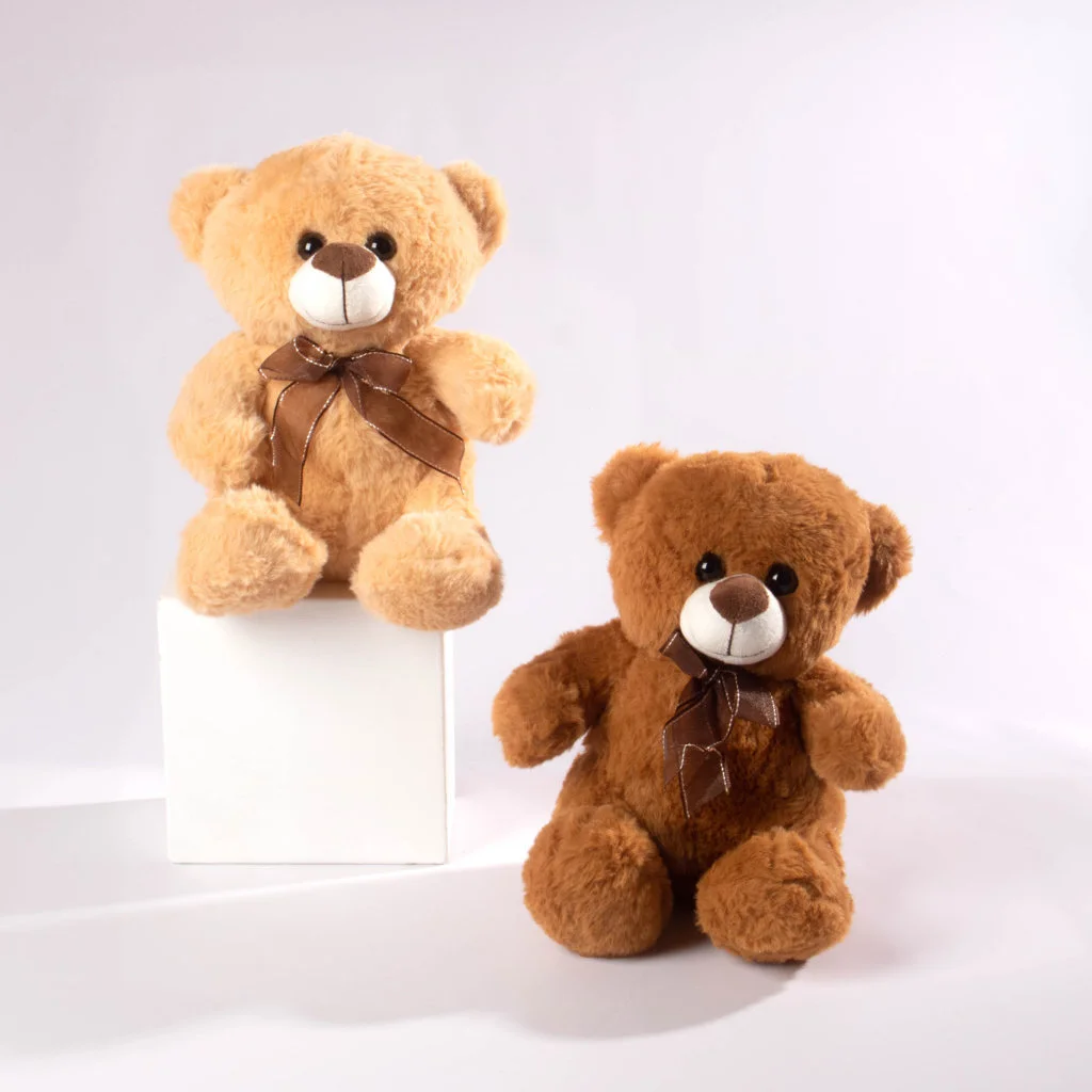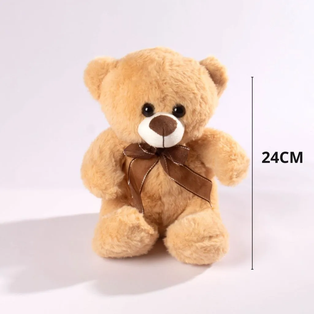 Peluche oso disponible en 2 colores, elaborado en tela tipo peluche suave al tacto y de alta calidad. Cuenta con un relleno de fibra compuesto por 35% felpa y 65% poliéster, lo que le brinda una textura esponjosa y agradable. Mide 24 cm de altura, siendo un regalo perfecto para cualquier ocasión especial. Su diseño incluye un lazo decorativo en el cuello, aportando un toque tierno y elegante.
