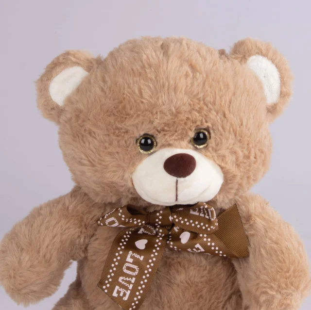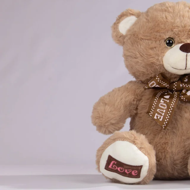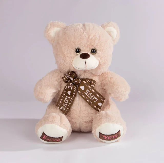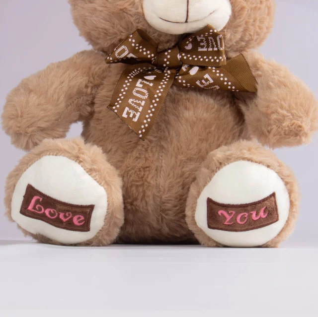 Oso de peluche disponible en dos tonalidades, con un elegante corbatín café decorado con la palabra “Love” y huellas bordadas en las patas. Elaborado con felpa extra suave y relleno esponjoso para una sensación cálida y agradable al tacto. Ideal para regalar en fechas especiales o para acompañar la decoración de cualquier espacio.
