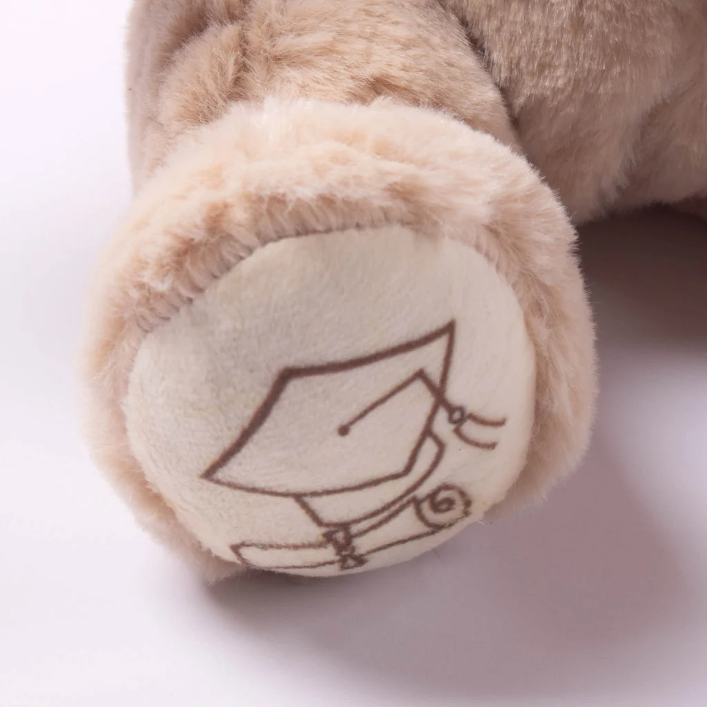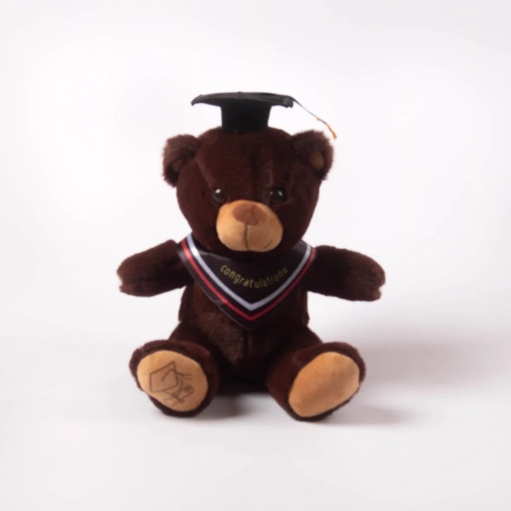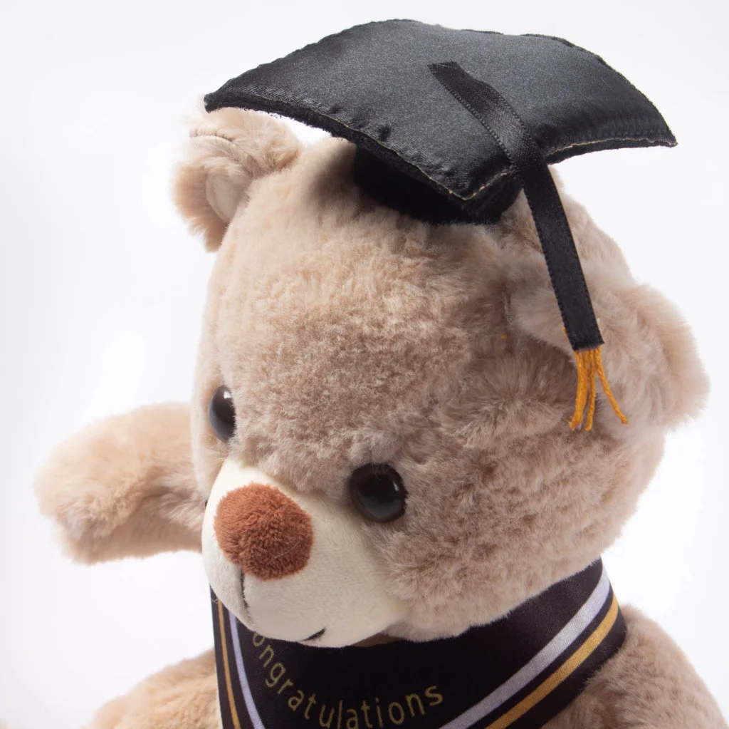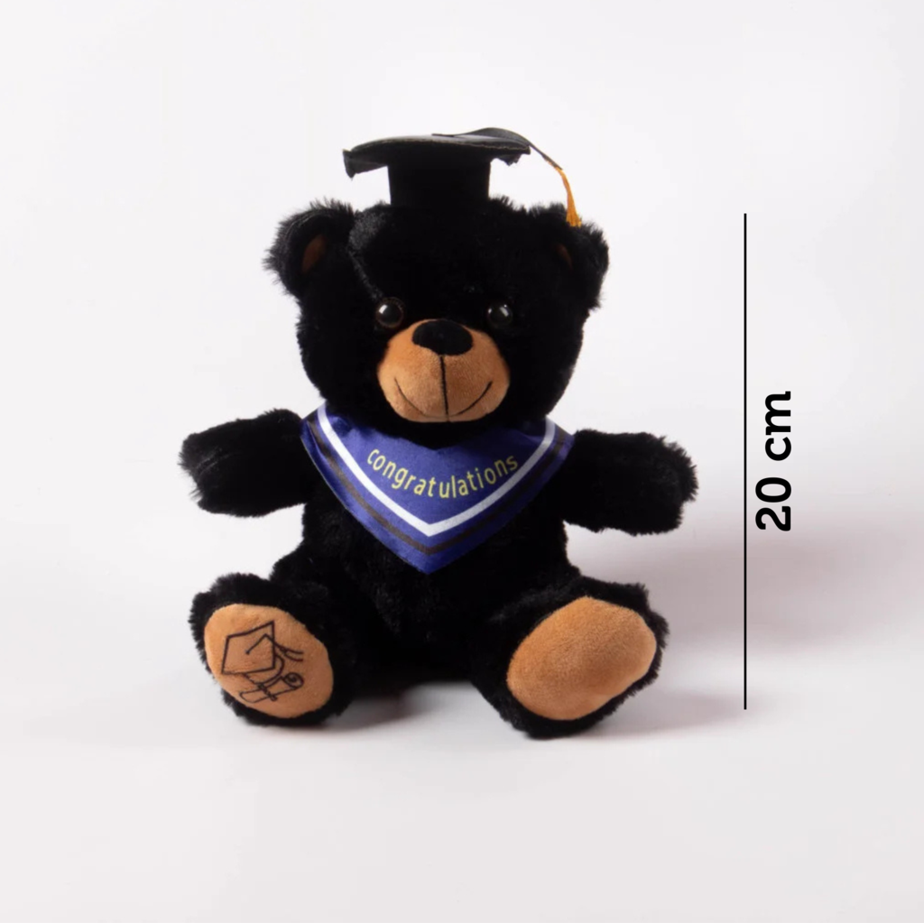 Peluche de oso con birrete de graduación, tierno y conmemorativo, disponible en tres colores. Su tamaño mini de 20 cm lo hace perfecto como detalle simbólico en celebraciones de grado o como recuerdo especial. Ideal para regalar a estudiantes de todas las edades.