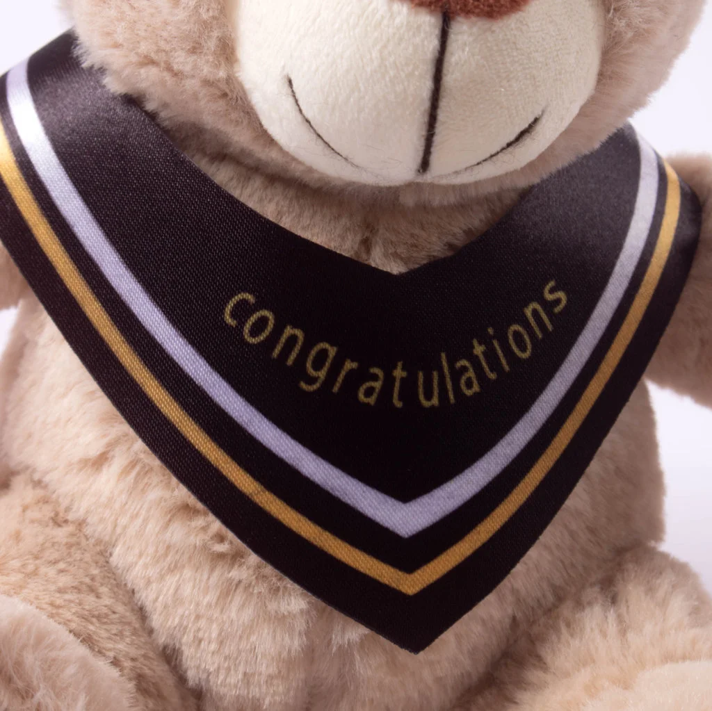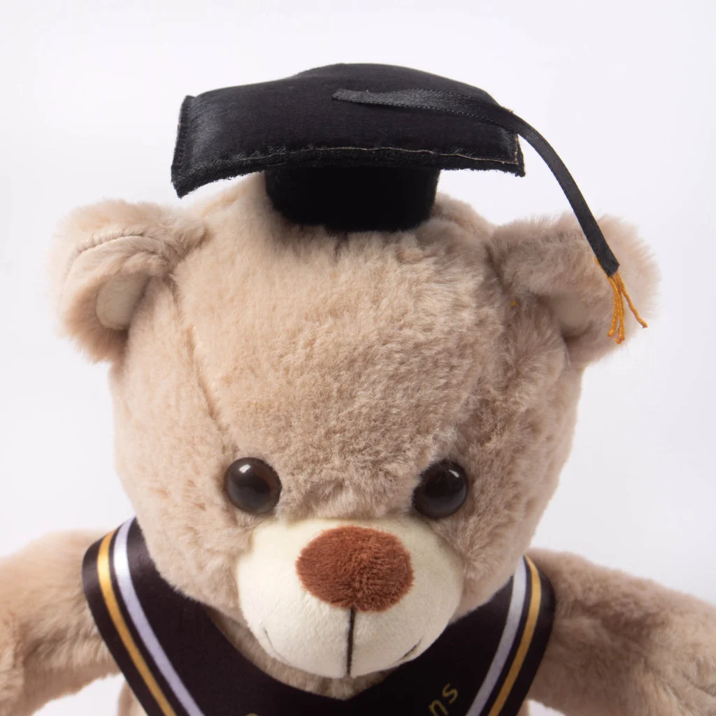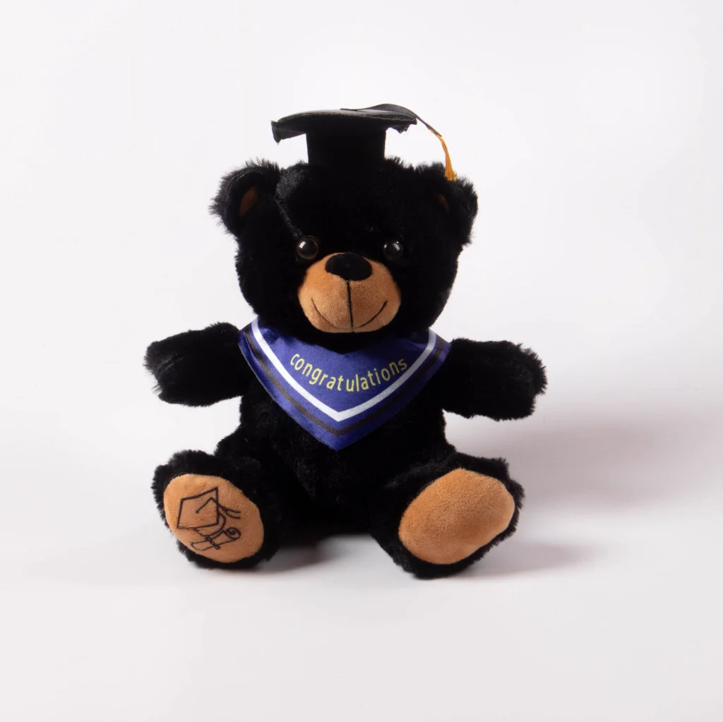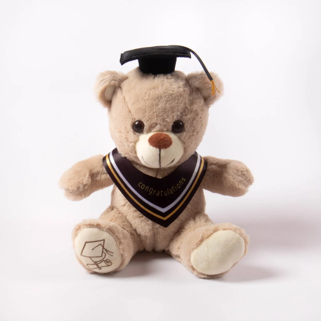 Peluche de oso con birrete de graduación, tierno y conmemorativo, disponible en tres colores. Su tamaño mini de 20 cm lo hace perfecto como detalle simbólico en celebraciones de grado o como recuerdo especial. Ideal para regalar a estudiantes de todas las edades.