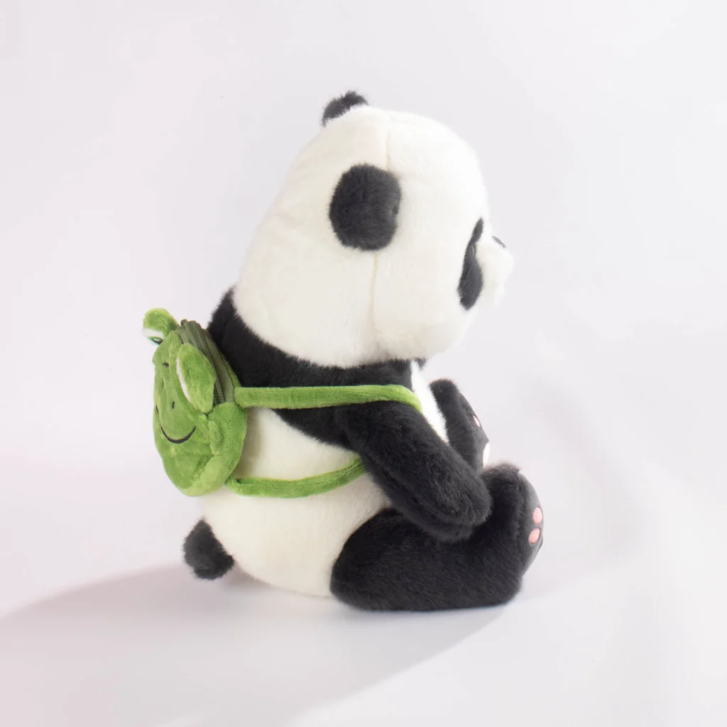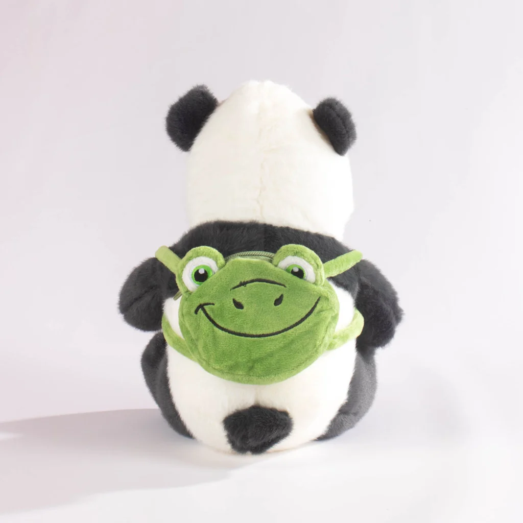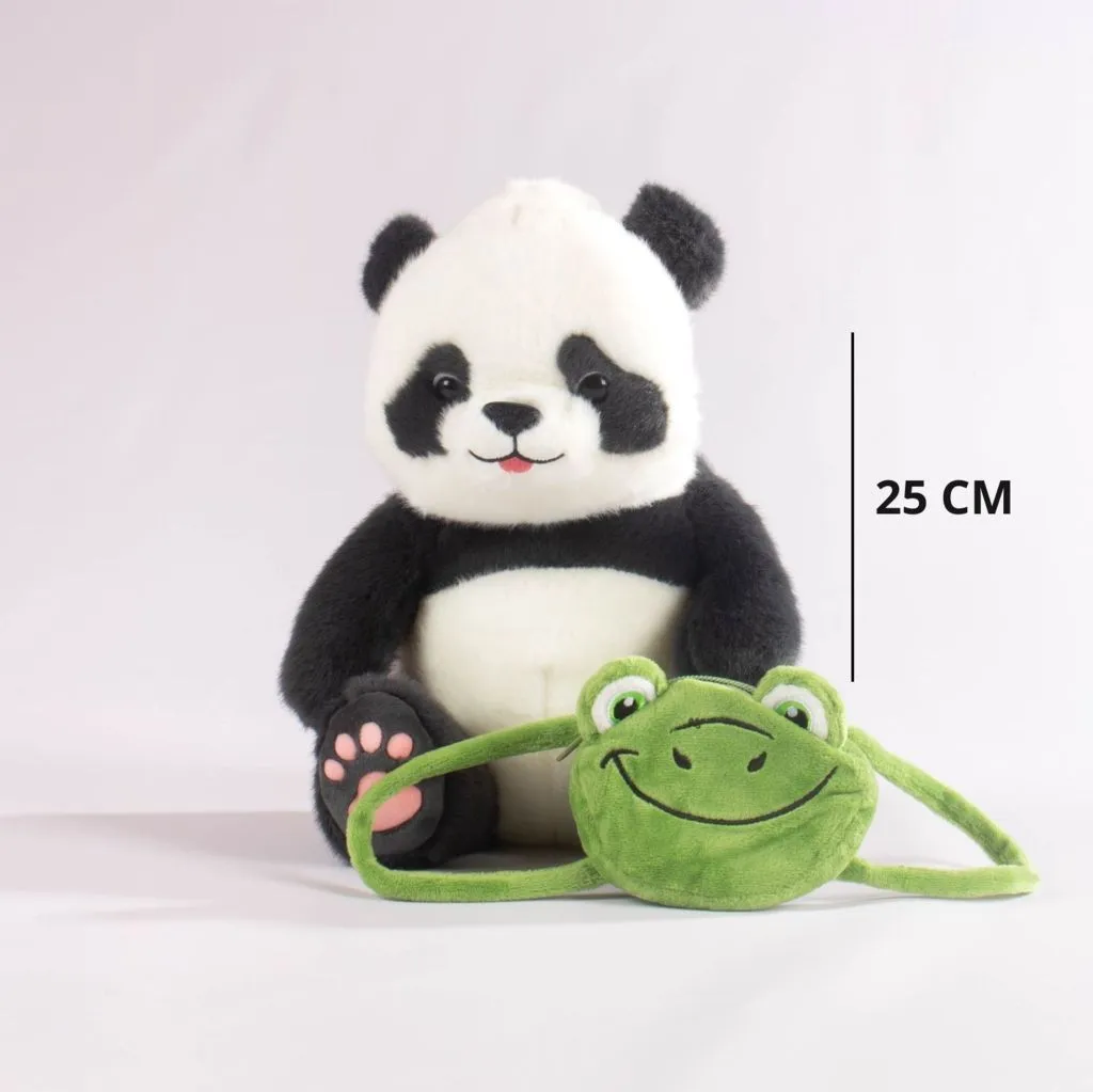 Este adorable oso panda de peluche destaca por su diseño esponjoso y su característico patrón en blanco y negro. Lleva un tierno bolso en forma de rana que lo hace aún más encantador. Sus patas con huellas rosadas le dan un toque dulce y único. Ideal para abrazar, decorar o regalar, su tamaño de 25 cm lo convierte en un compañero ideal para grandes y chicos.
