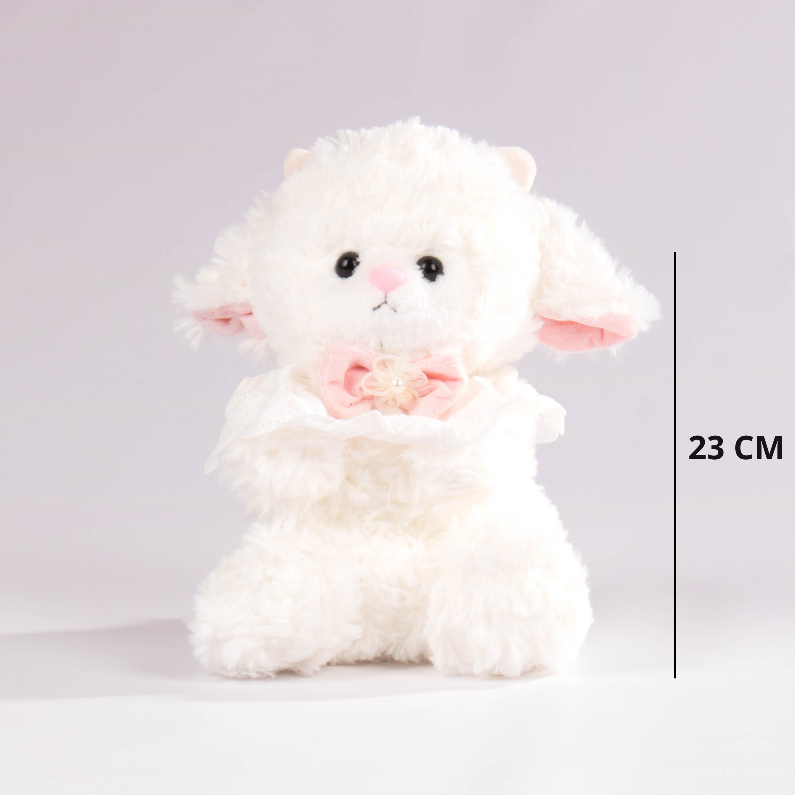 Un tierno peluche de oveja con un encantador collar, ideal para regalar en cualquier ocasión o decorar espacios con dulzura. Su diseño suave y abrazable lo convierte en un compañero perfecto para todas las edades.