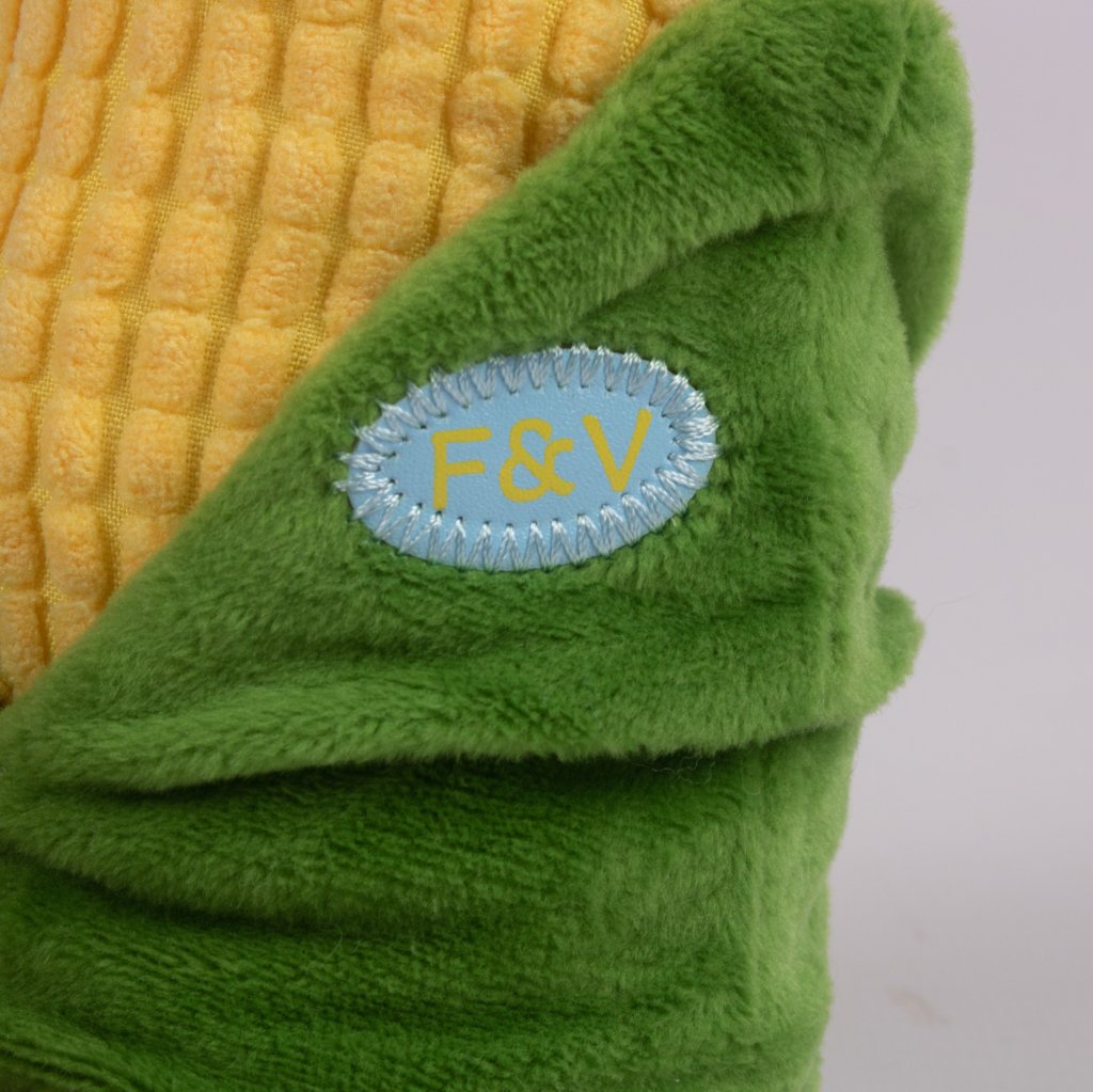 Detalles: Hojas verdes en felpa y puntas del maíz bordadas