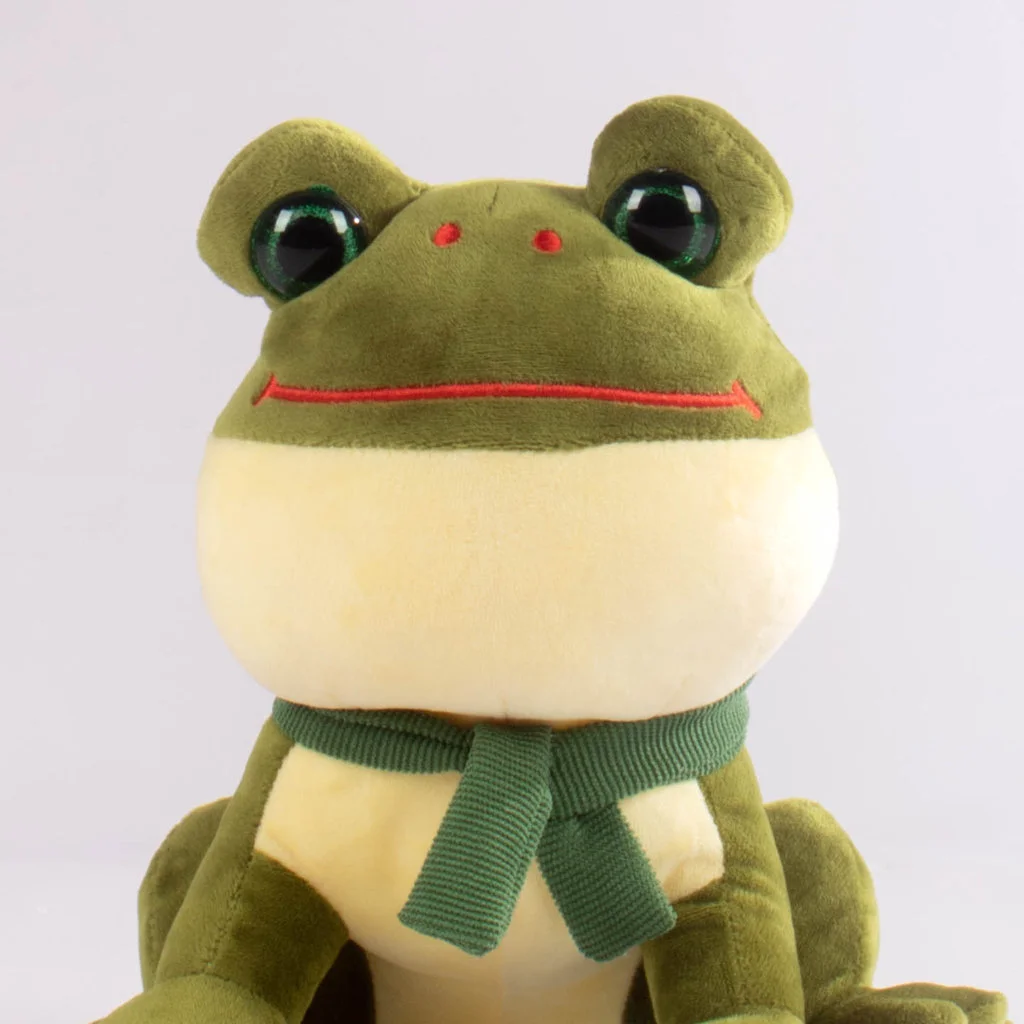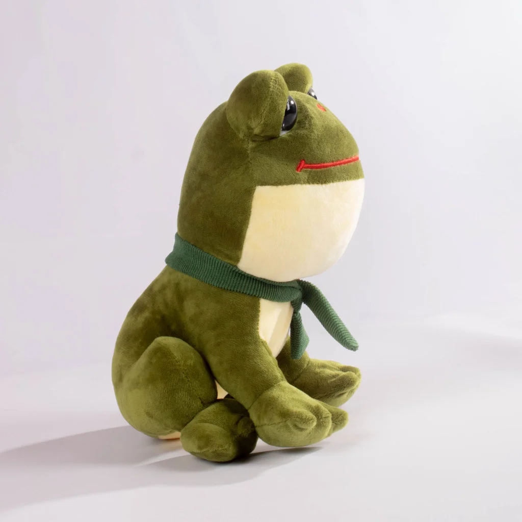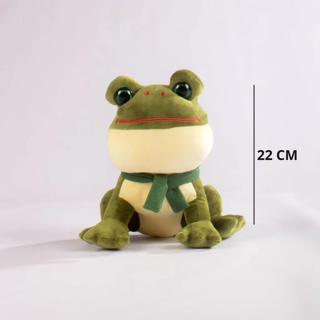 Esta tierna rana de peluche destaca por su suave cuerpo verde oliva y su pancita beige. Con grandes ojos brillantes y una pequeña sonrisa bordada en rojo, es una figura entrañable y simpática. Además, lleva una bufanda que le da un toque aún más encantador. Es el peluche perfecto para regalar en cualquier ocasión, transmitiendo alegría y ternura.