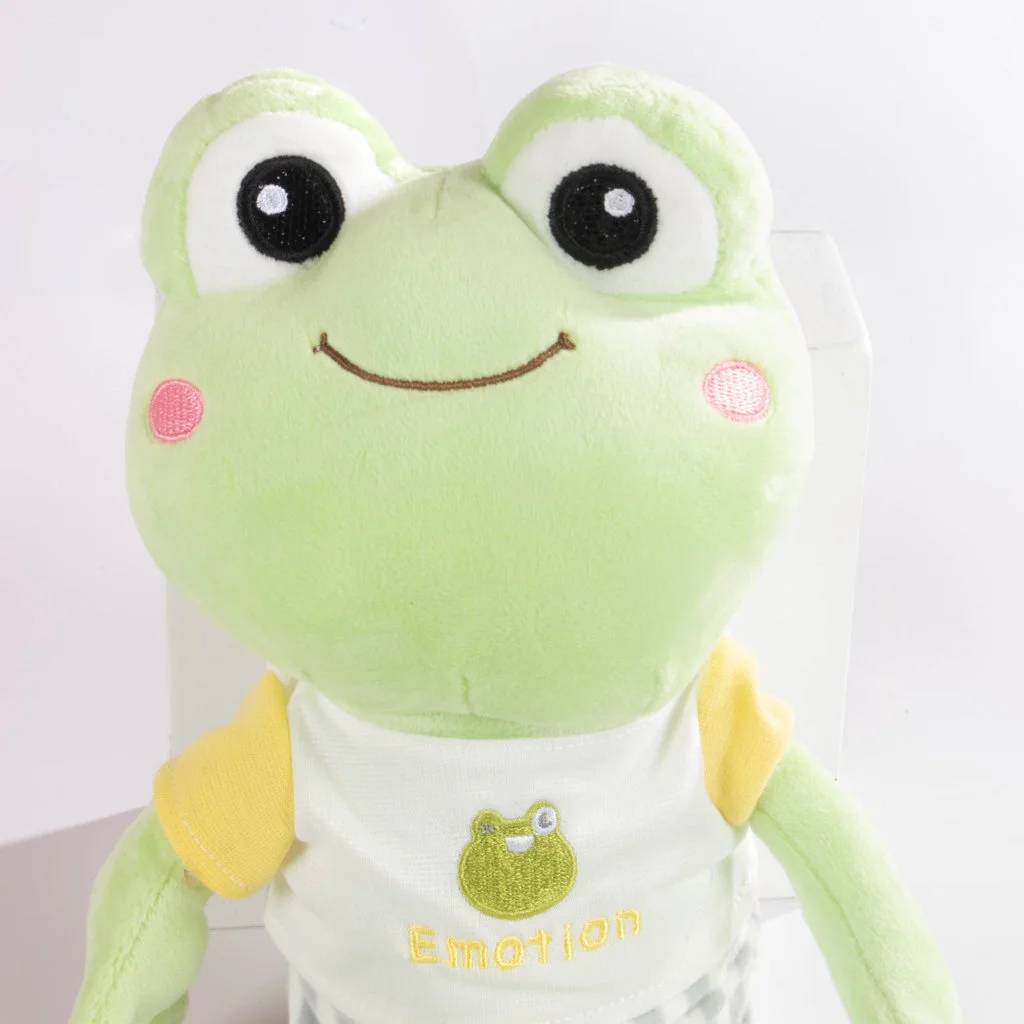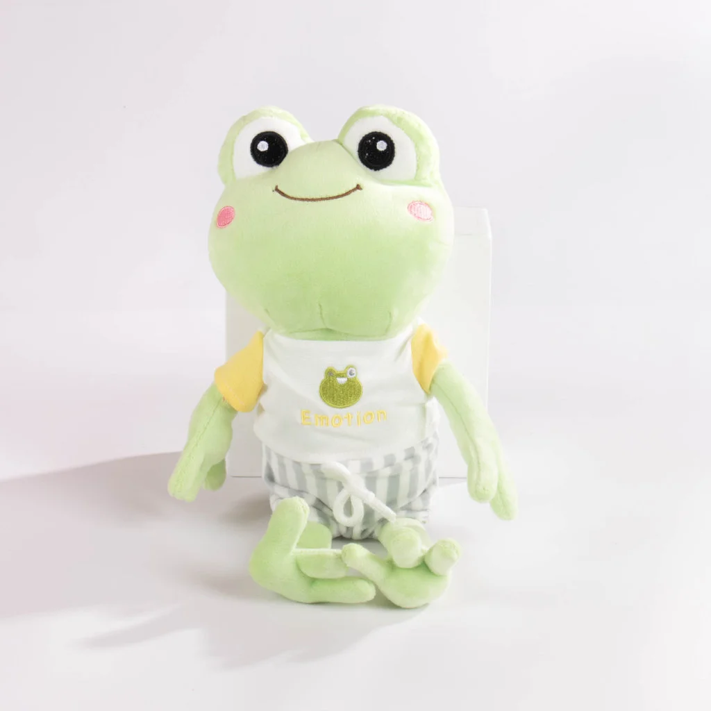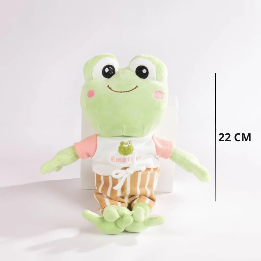 Este peluche de rana es una ternura total. Con caritas sonrientes, mejillas rosadas y una apariencia amigable, viene vestido con conjuntos adorables: uno en tonos amarillos y grises, y otro en tonos rosados y marrones, combinando camiseta y pantalones de rayas. Perfecto para quienes aman los personajes dulces y con estilo.