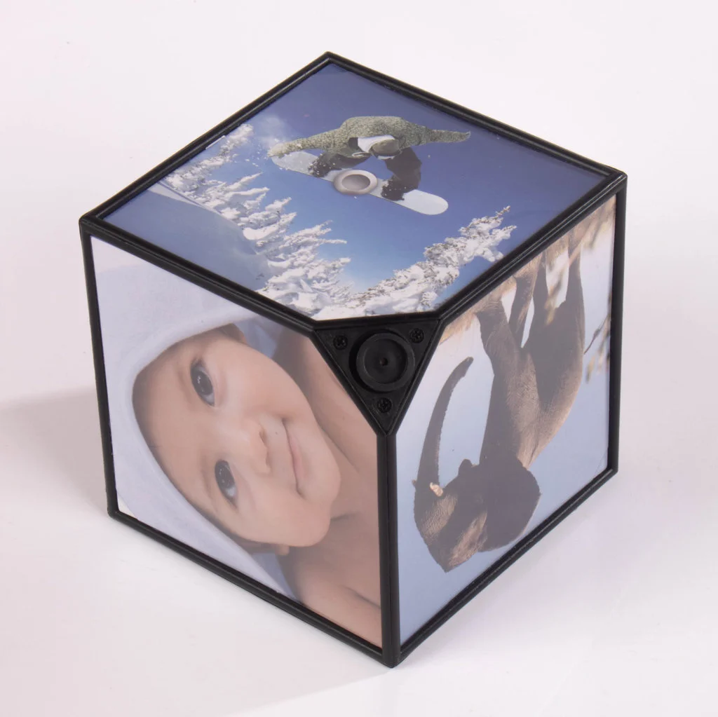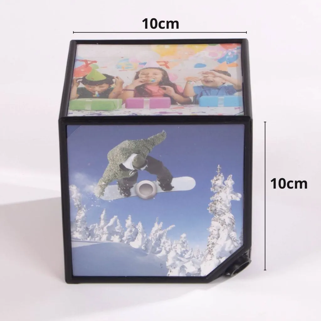 Portafotos giratorio con diseño innovador y funcional. Este portafotos tiene espacio para varias imágenes, las cuales pueden visualizarse al girar una rueda incorporada. Al colocarlo sobre un extremo en un punto estable, comienza a girar de manera fluida, mostrando cada una de las fotos incluidas. Es un artículo ideal para decorar espacios como oficinas, salas o dormitorios, permitiendo revivir recuerdos de manera dinámica y original.