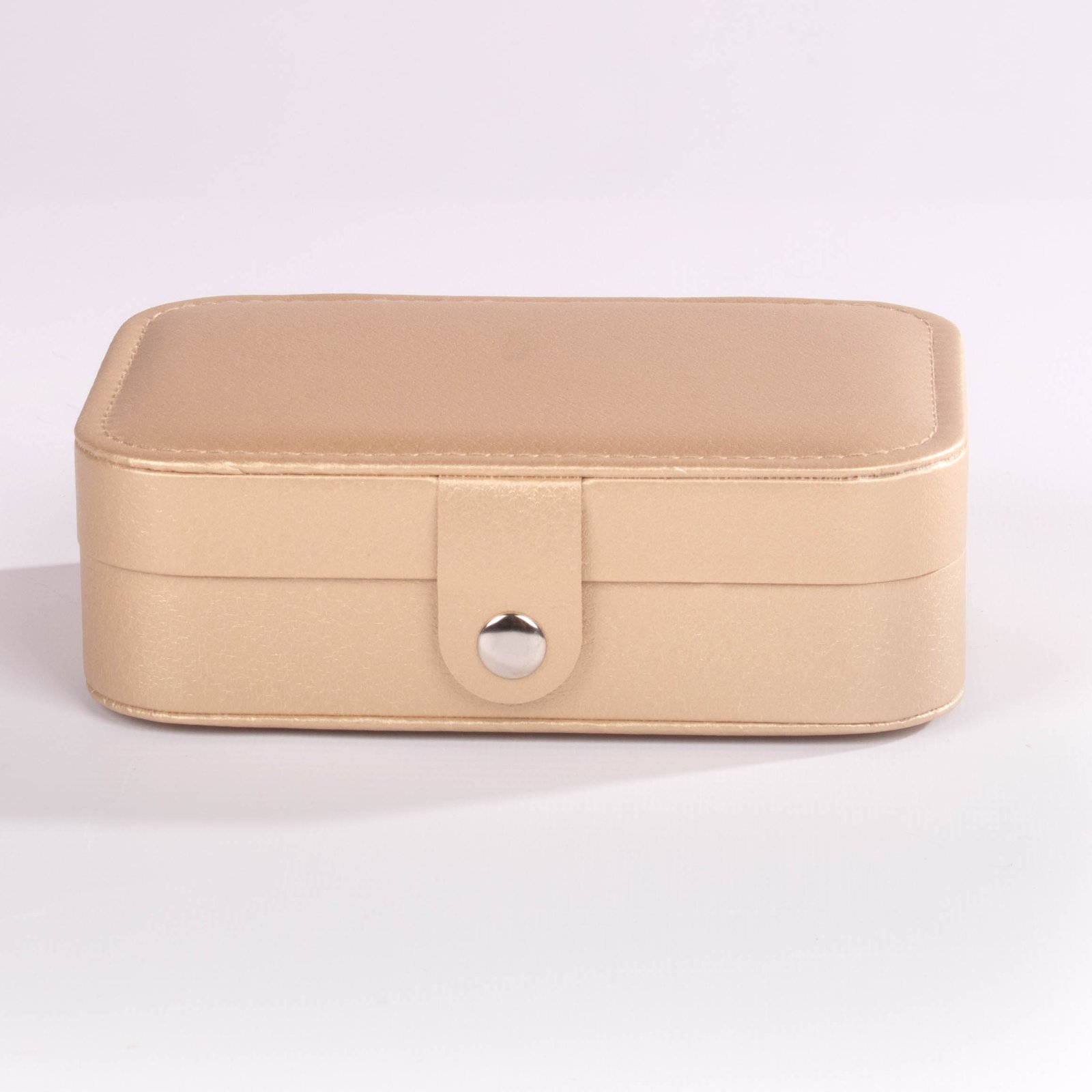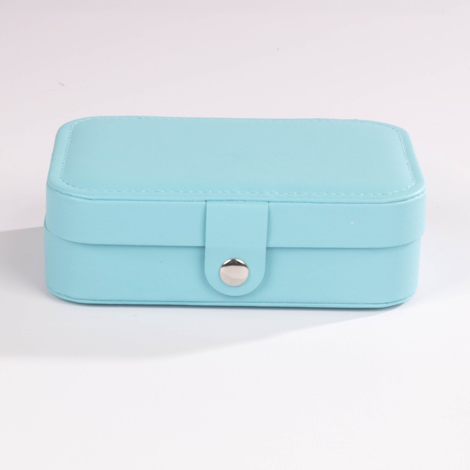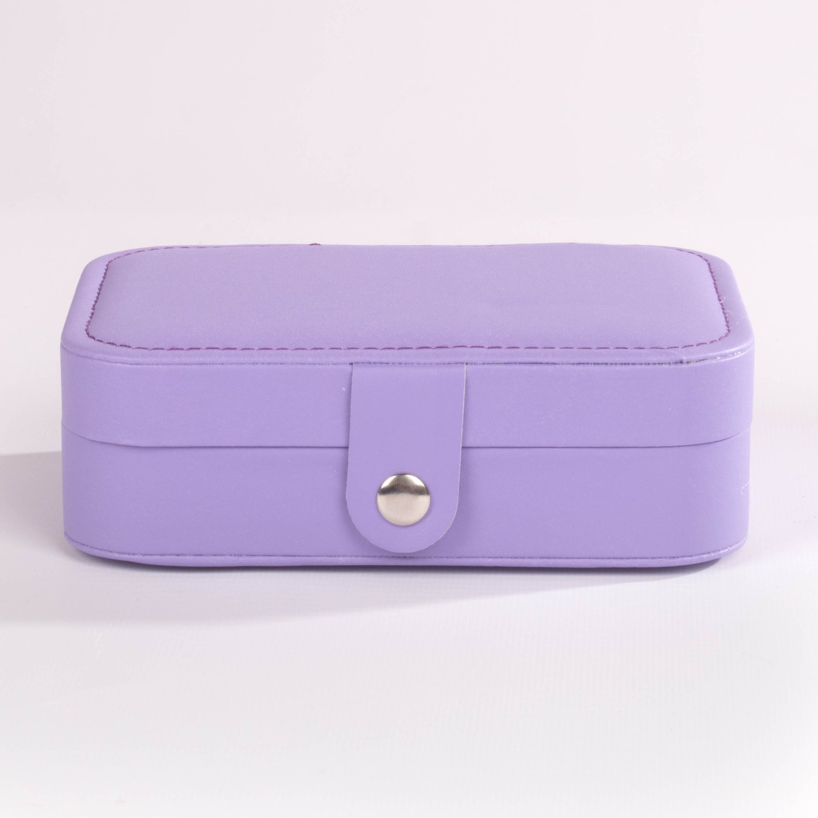 Porta joyero rectangular con cierre de broche metálico, diseñado para mantener tus accesorios protegidos y organizados. Su diseño compacto permite llevarlo fácilmente en la cartera o maleta, siendo ideal para viajes o uso diario. Incluye compartimentos internos adaptados para guardar anillos, aretes, cadenas y otros accesorios. Disponible en colores dorado, lila, beige, nude, azul y negro.