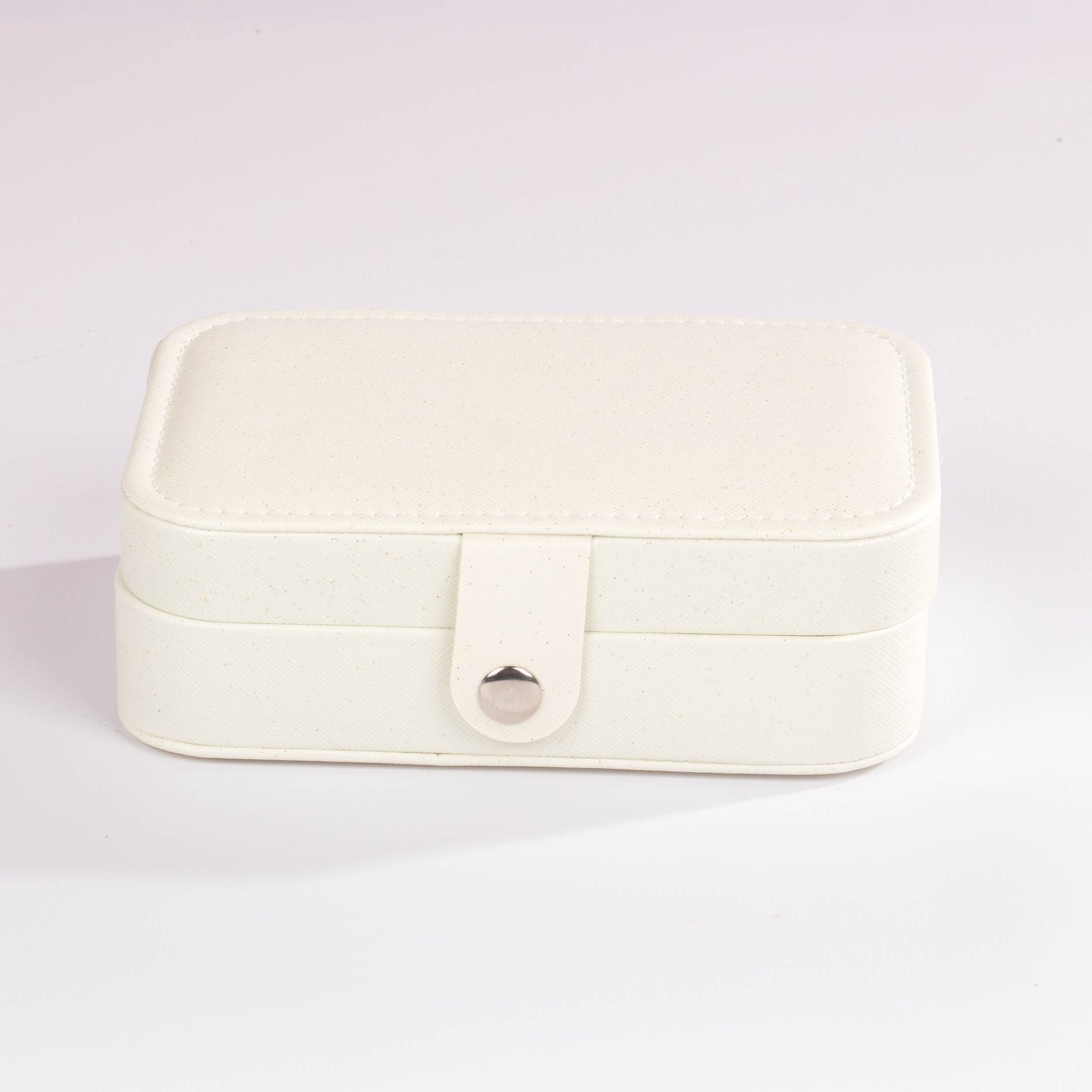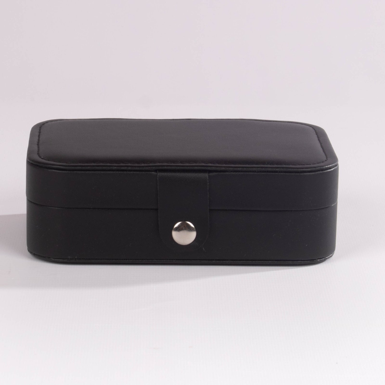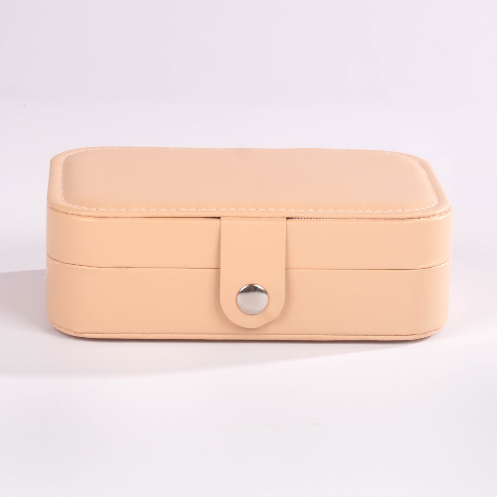 Porta joyero rectangular con cierre de broche metálico, diseñado para mantener tus accesorios protegidos y organizados. Su diseño compacto permite llevarlo fácilmente en la cartera o maleta, siendo ideal para viajes o uso diario. Incluye compartimentos internos adaptados para guardar anillos, aretes, cadenas y otros accesorios. Disponible en colores dorado, lila, beige, nude, azul y negro.