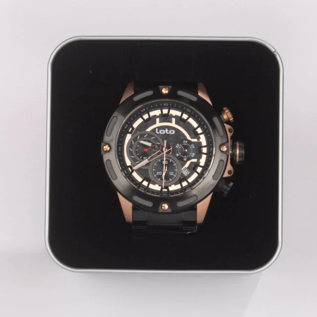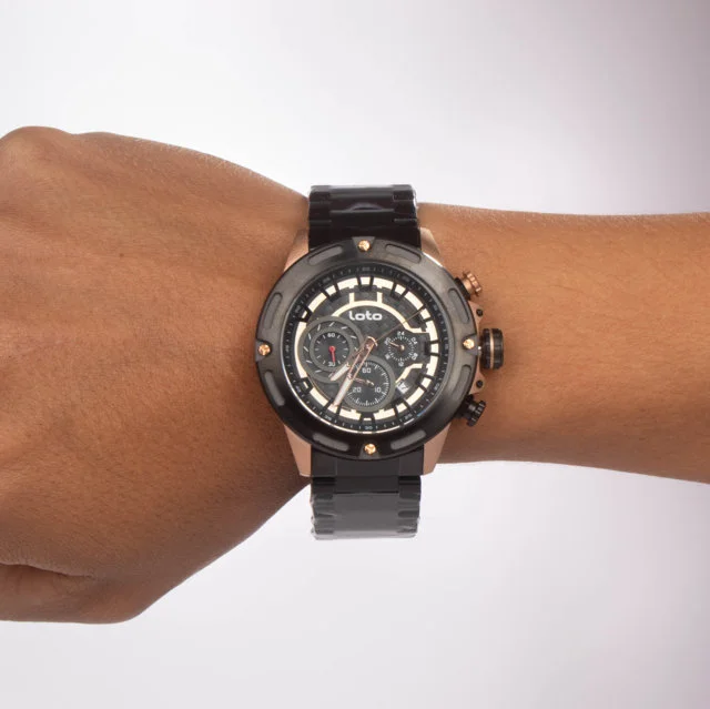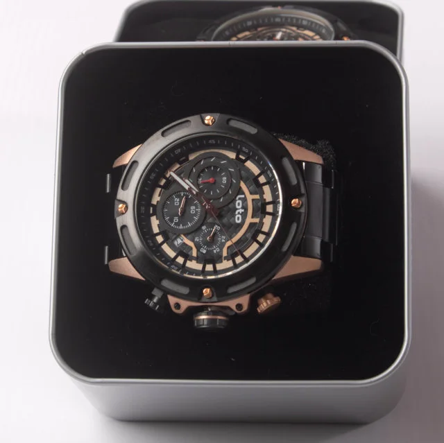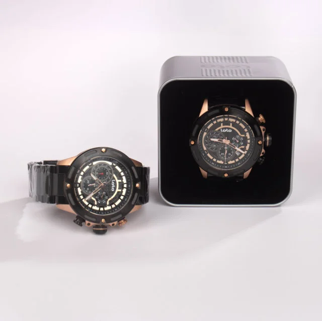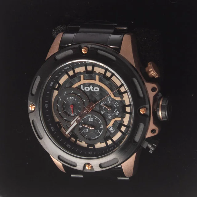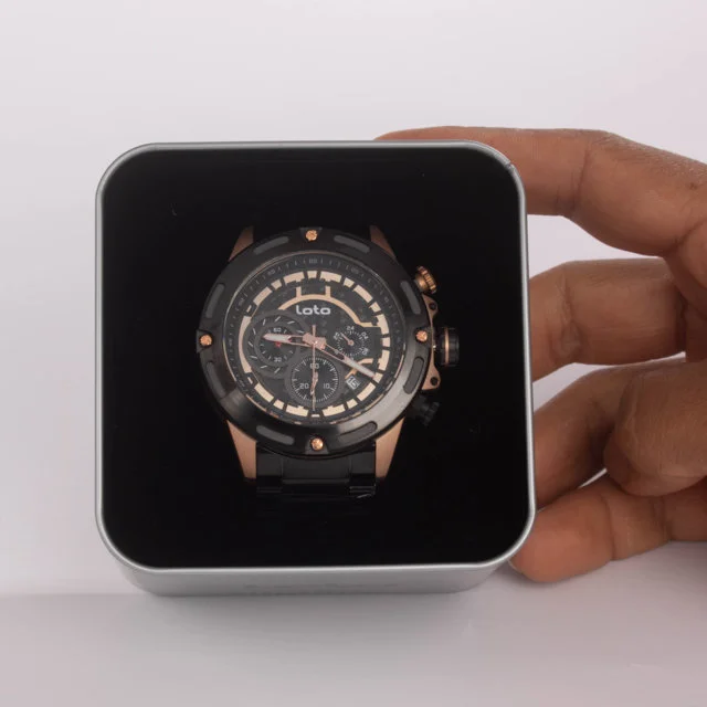Reloj Loto original análogo con cronógrafos funcionales, de diseño imponente y moderno. Su caja metálica con bisel negro y pulso acerado lo convierten en un accesorio de gran carácter. Disponible en color negro con detalles en oro rosa. Resistente a salpicaduras de agua, lavado de manos y lluvia ligera. Incluye 6 meses de garantía por maquinaria y pila.