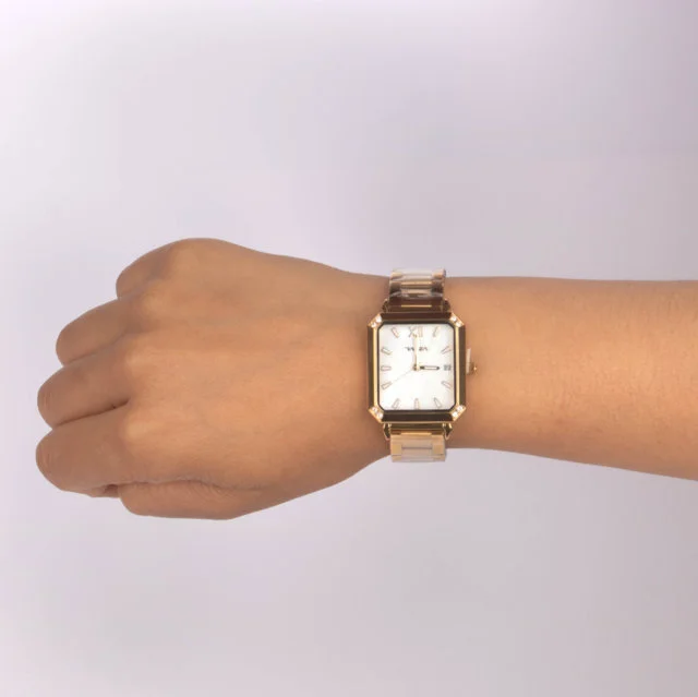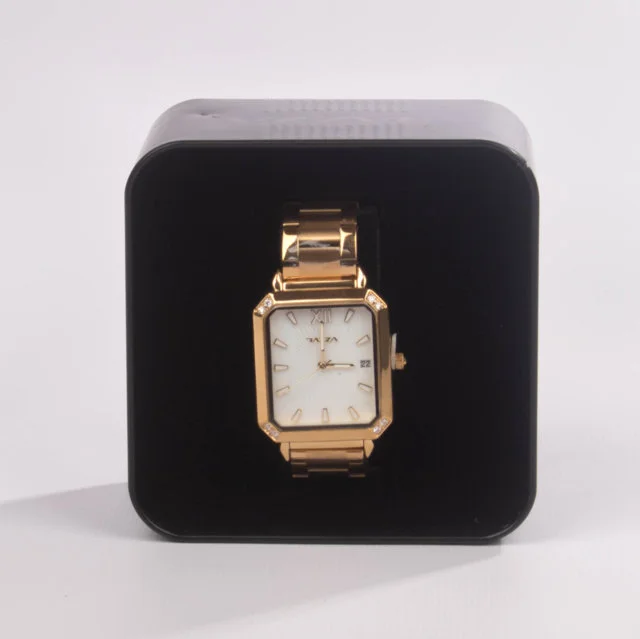 Reloj Razza original para dama, con diseño análogo elegante y sofisticado. Su caja metálica rectangular con acabados finos se combina con un pulso acerado en tono dorado, creando un accesorio moderno y femenino. Ideal para quienes buscan un reloj versátil que complemente tanto looks formales como casuales. Incluye 6 meses de garantía por maquinaria y pila, lo que respalda su calidad y funcionamiento.