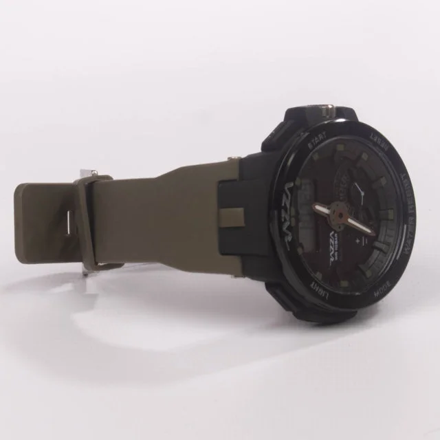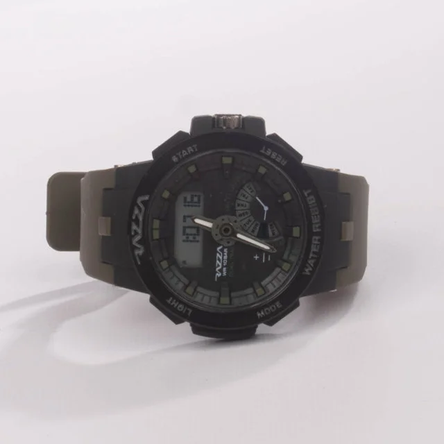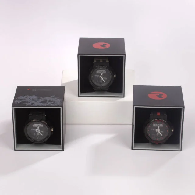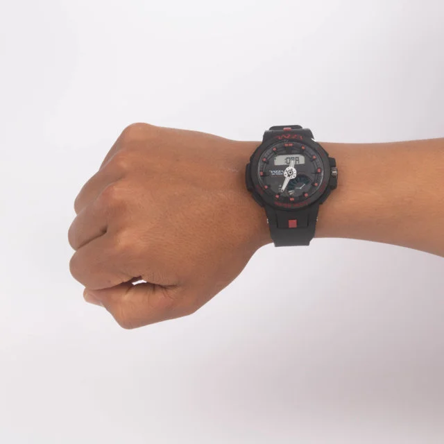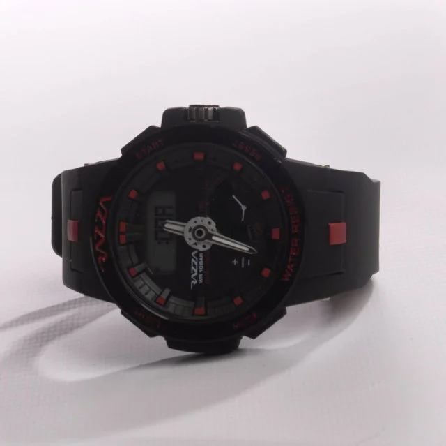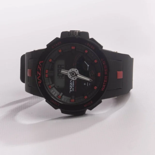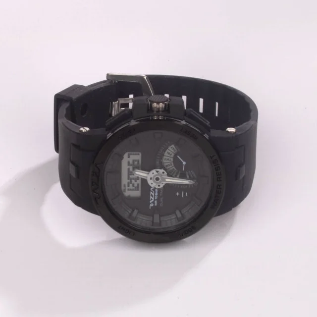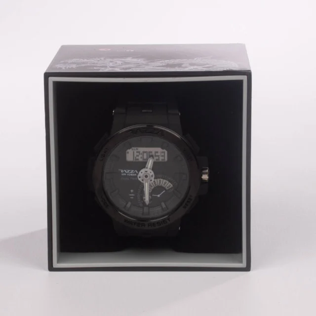 Reloj Razza original con doble hora, ideal para quienes buscan un accesorio funcional y resistente para el día a día. Su diseño combina una caja robusta con un pulso plástico cómodo y duradero. Disponible en tres presentaciones de color: negro con detalles rojos, totalmente negro y camuflado. Incluye 6 meses de garantía por maquinaria y pila, lo que respalda su calidad y buen funcionamiento.