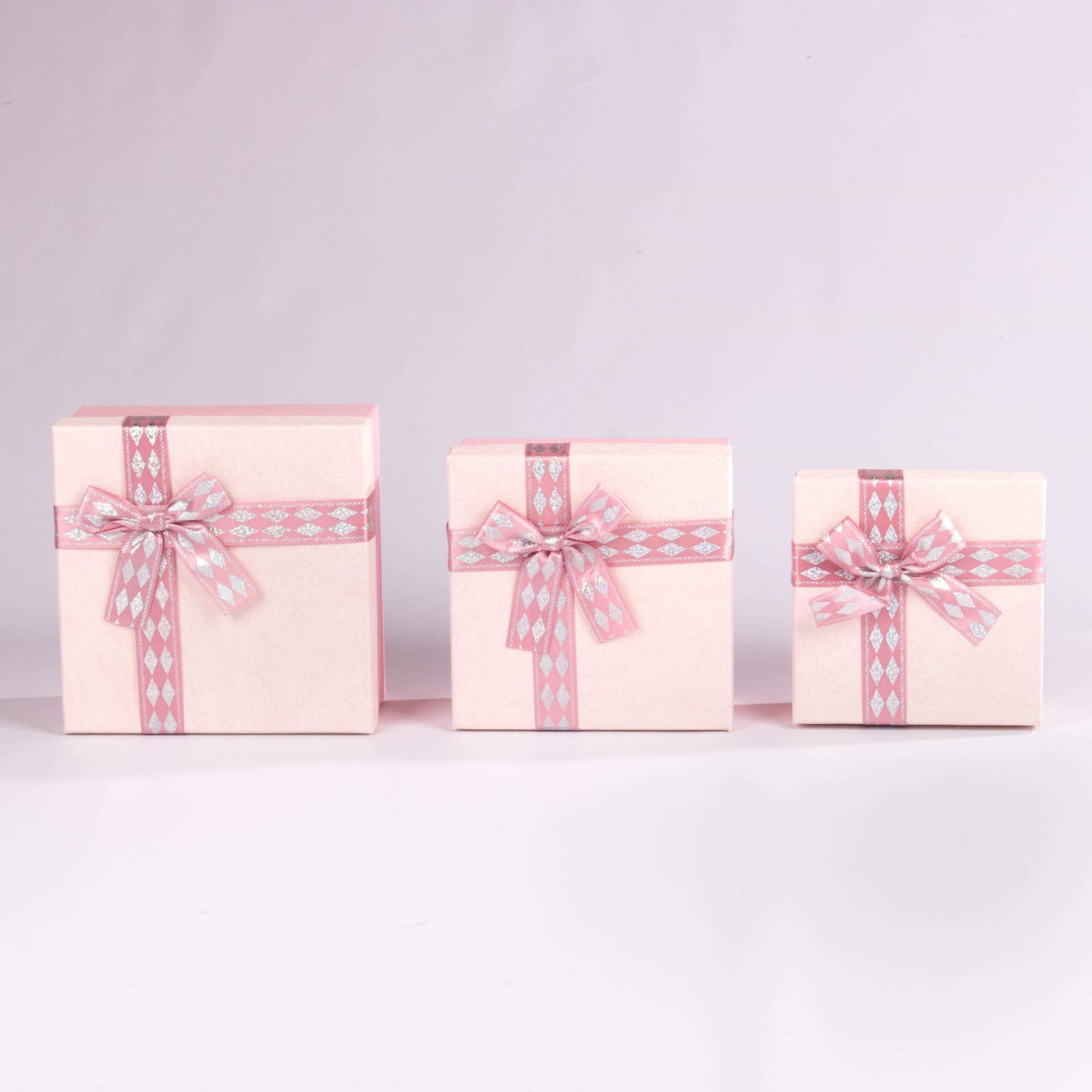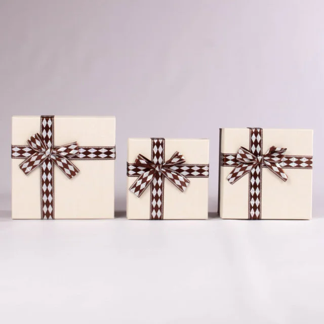 Set de tres cajas decorativas para regalo con diseño elegante y lazo decorativo. Ideales para presentar obsequios de manera especial en ocasiones como cumpleaños, aniversarios, bodas o celebraciones. Las cajas vienen en tres tamaños diferentes y se venden únicamente en conjunto.
