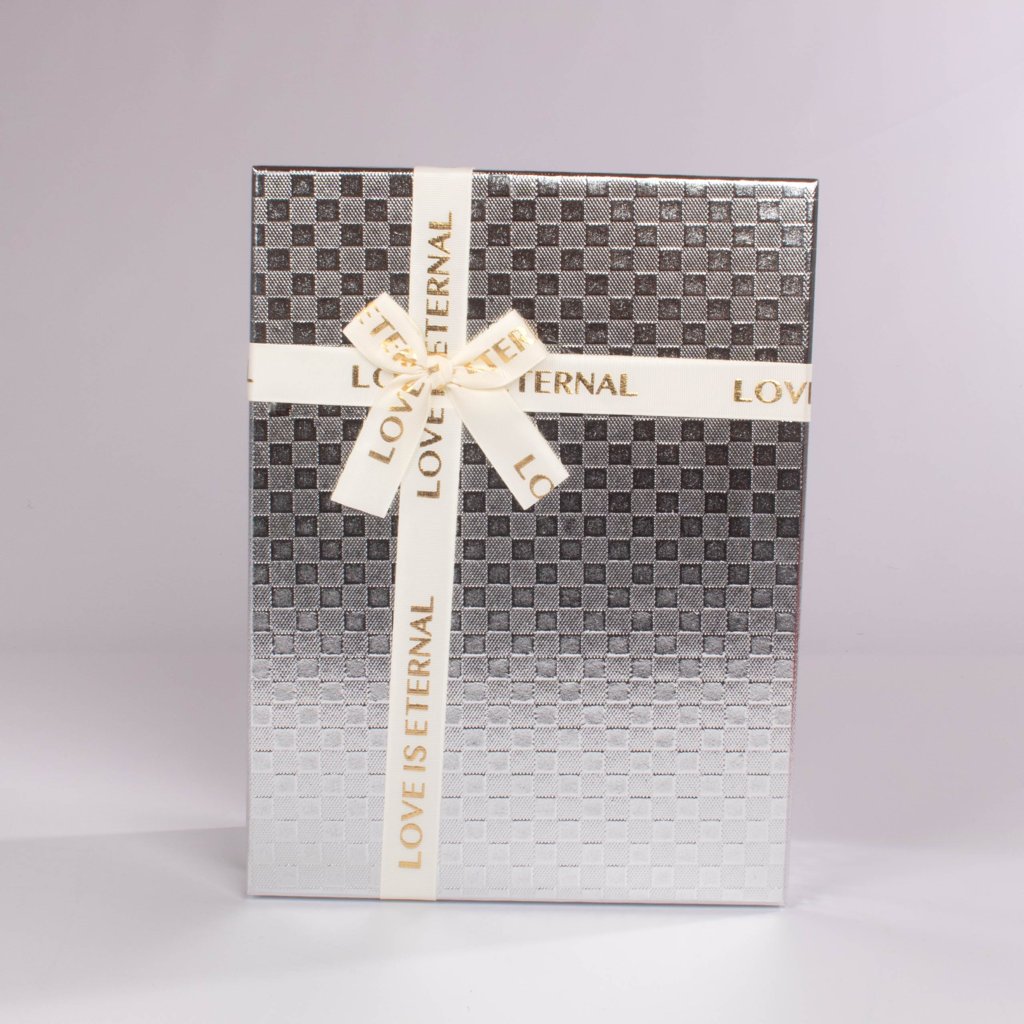 Material: Cartón rígido forrado en papel decorativo con acabado brillante y cinta de tela con aplique central.