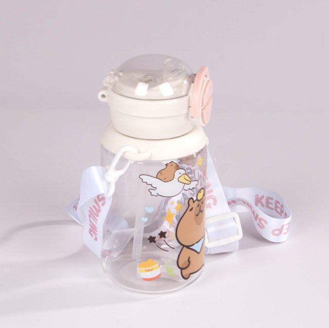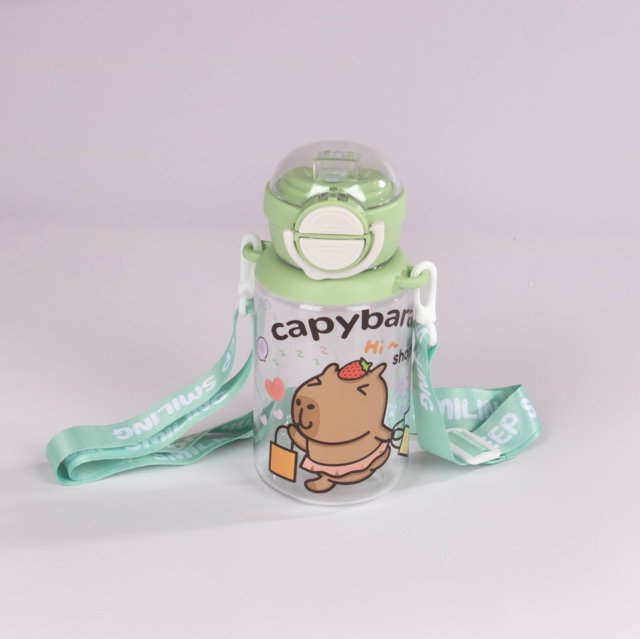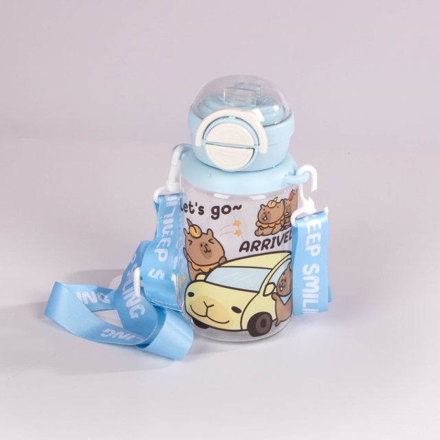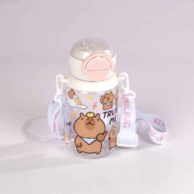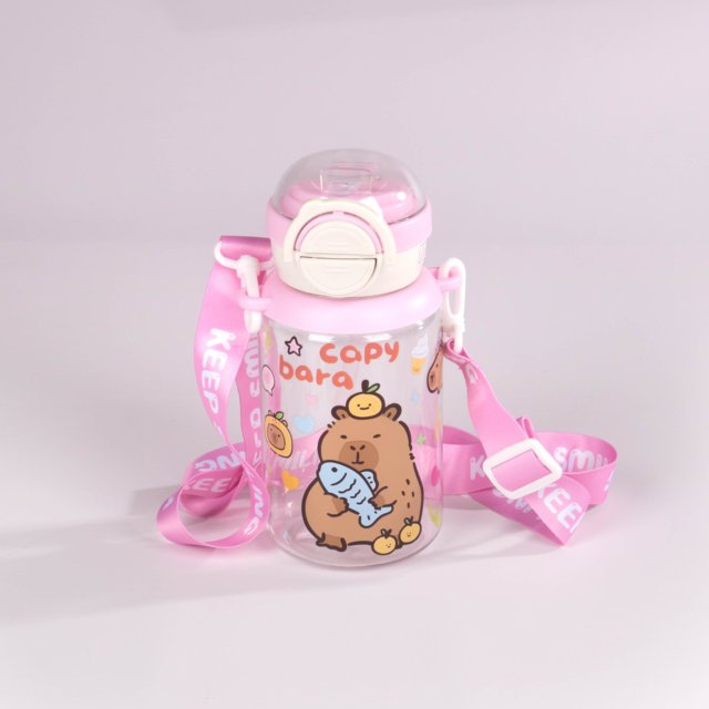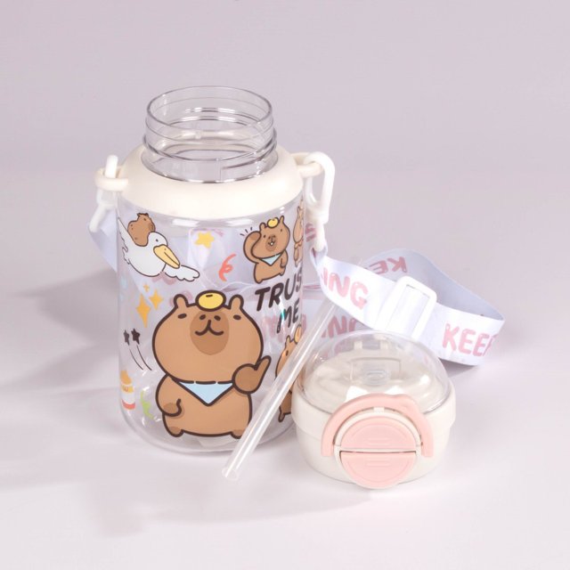 Termo plástico con adorables diseños de capibaras, disponible en varios colores. Incluye correa ajustable para llevarlo cómodamente a cualquier lugar. Ideal para mantener tus bebidas favoritas siempre contigo, ya sea en el colegio, la oficina o salidas al aire libre.
